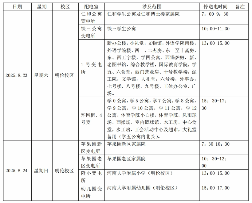 明伦校区电力检测工作将于2025年8月23日开始,期间需依次对明伦校区各配电室及箱变进行停电,停电计划见下表。
