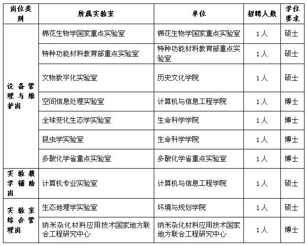根据河南大学实验室承担工作任务需求,拟招聘实验室技术人员10名(其中硕士研究生5名,博士研究生5名)。公告如下: