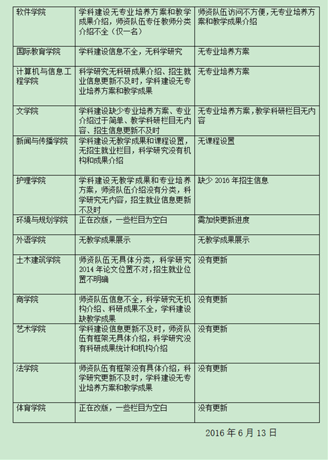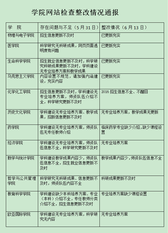 根据学院网站检查工作安排,6月13日下午,校党委宣传部会同教务处、招生办、信息化管理办公室对各学院网站建设检查开展“回头看”。现将各学院整改情况公布如下。希望有关学院采取得力措施,加大工作力度,进一步做好网站的整改完善工作,为考生查询相关报考信息提供便利。