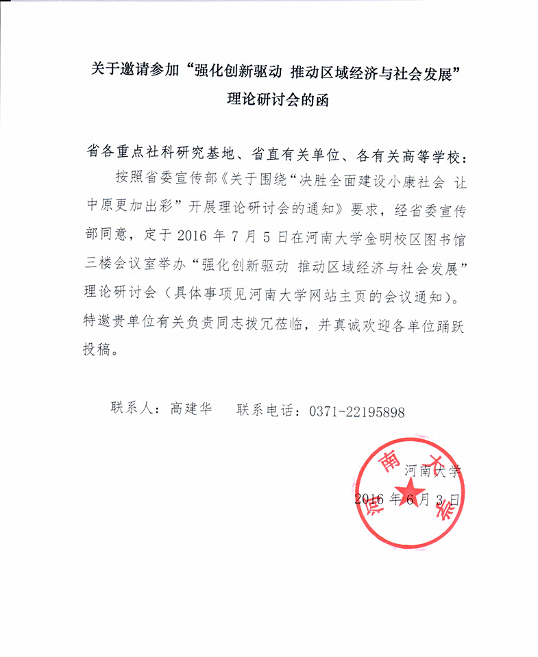 关于邀请参加“强化创新驱动 推动区域经济与社会发展”理论研讨会的函