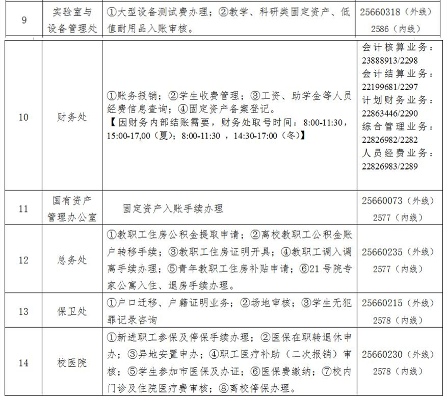 第一批将有党政办公室、教务处、科研处、社科处、人事处、学生处、研究生院、国际交流处、实验室与设备管理处、财务处、国有资产管理办公室、总务处、保卫处、校医院等14个单位进驻,可办理服务事项58项(见下表)。试运行期间办理事项可能进行调整完善,请以校园网和办事大厅大屏幕最新公布为准。