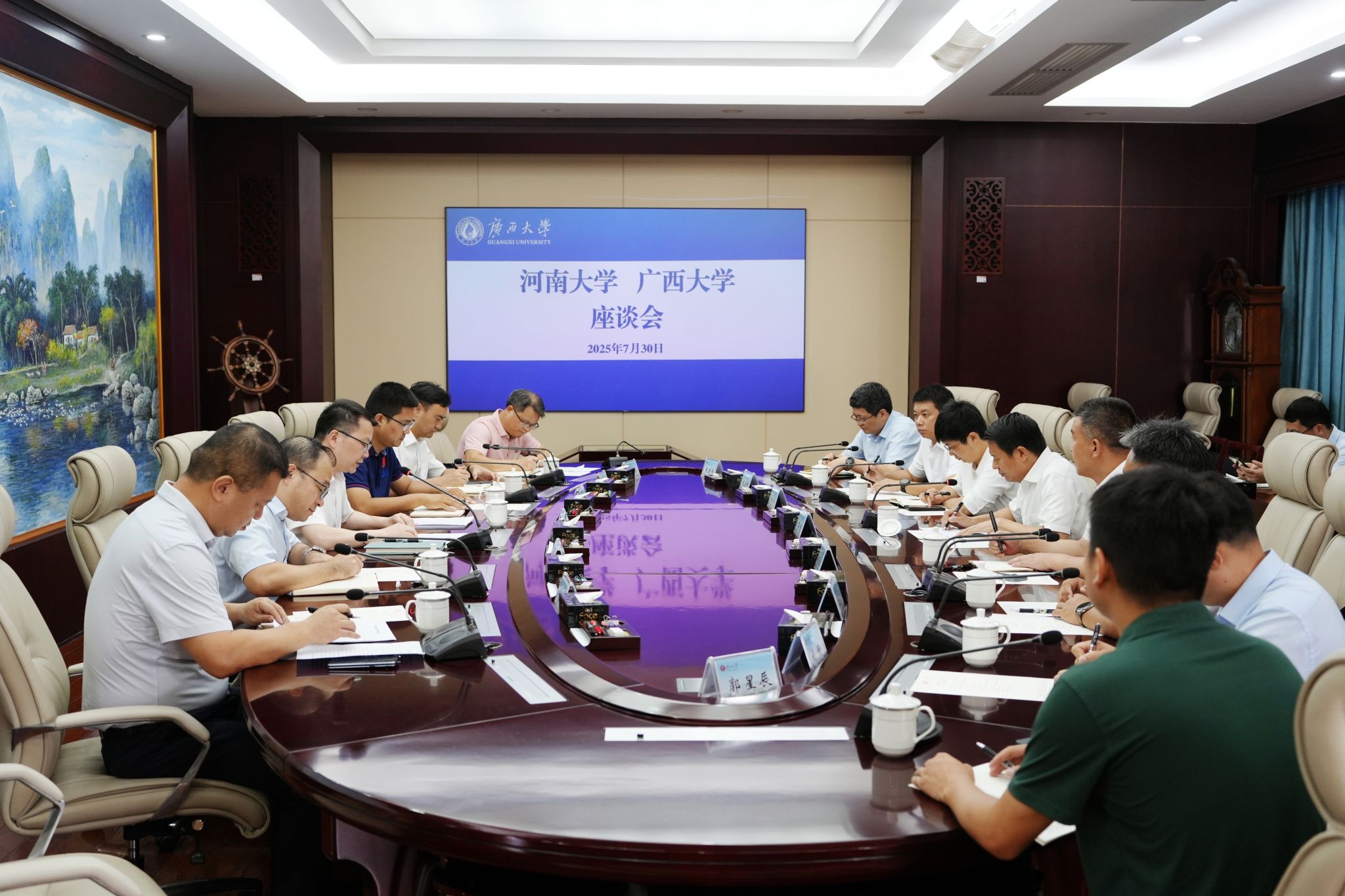 上午,季波一行来到广西大学。广西大学党委书记李国忠对季波一行的到来表示诚挚欢迎,他表示,广西大学与河南大学共同肩负推进“双一流”建设和教育强国建设的重要使命,希望双方携手共进,共同探索高等教育发展的新路径。座谈会上,广西大学党委常委、常务副校长赵双良简要介绍了广西大学近年来的发展成就和治校经验,他表示,希望双方进一步加强交流,强化制度保障,探索建立长期合作机制,实现优势互补。季波对广西大学在“双一流”建设中取得的卓越成就给予高度评价,并表示两校历史渊源深厚、发展路径相似,广西大学建设经验对河南大学发展具有重要启示。当前,河南大学践行“两高四着力”重大要求,锚定“强理振文、新工新医”办学新主线,发展势头强劲。希望通过此次调研,促进两校实质性战略合作,协同探索中西部高校在“双一流”建设中的协作新范式,共同为教育强国建设贡献力量。