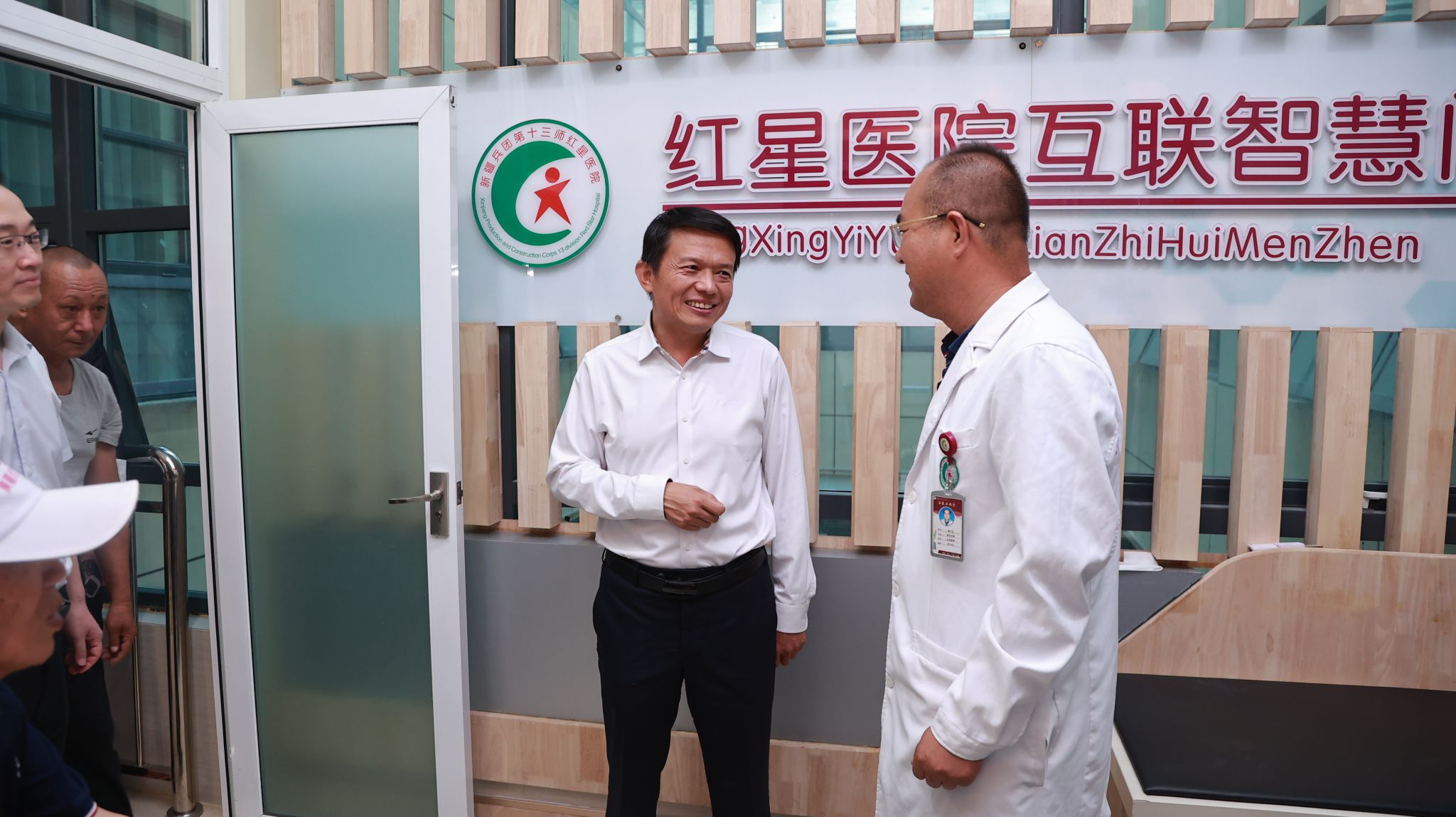 季波一行首先来到具有80 年历史的红星医院。第十一批河南援疆前方指挥部副总指挥、党委副书记兼纪委书记,第十三师新星市党委副书记、副师长徐良对季波一行的到来表示诚挚欢迎。他表示,非常感谢河南大学10余年来先后选派18位医德高尚、医术精湛的医疗专家援建红星医院,援建专家们扎实开展各项医疗援助工作,坚持“输血”与“造血”并重,为红星医院在重点学科突破、薄弱学科提升、管理体系优化等方面作出了积极贡献。季波一行走访了红星医院院史馆、康复科、心内科、消化科及韩大正名医工作室,深入了解医院的发展历程与援疆工作取得的成效,对红星医院建院80年来在医疗技术创新、服务患者等方面取得的成绩给予高度评价,对淮河医院、第一附属医院的援疆工作给予充分肯定。特别是专家们结束援疆工作后仍与所在学科保持很好的学科互动,通过线上、线下等多种形式开展疑难病例讨论、定期回院坐诊手术、开设名医工作室、举办豫哈学术交流活动等形式,延续着对医院的帮扶值得称赞。季波强调,我们要在巩固原有医疗援疆成果的基础上,持续探索互助合作新机制,为豫哈两地的医疗卫生事业发展作出新贡献。