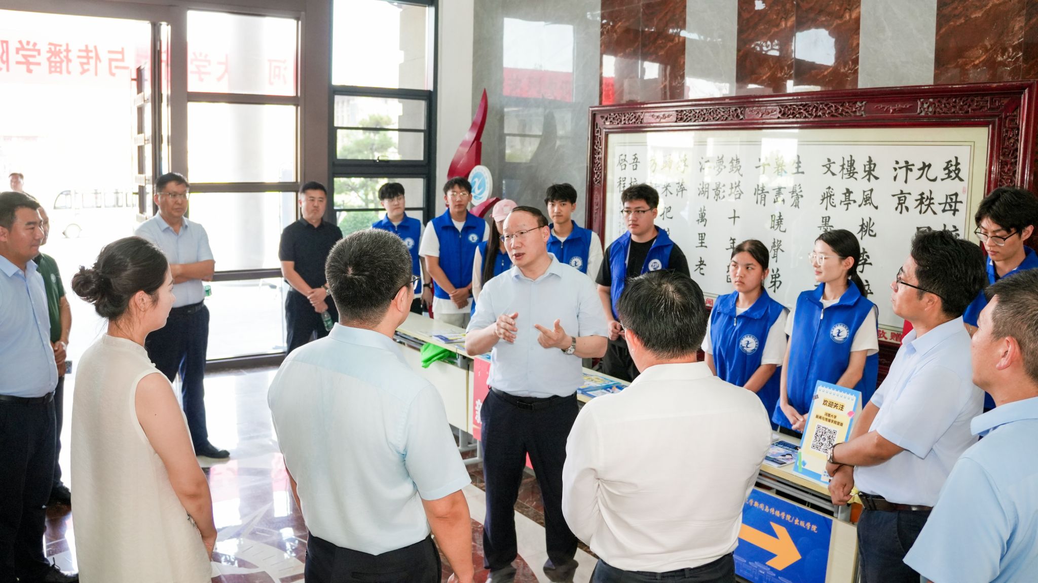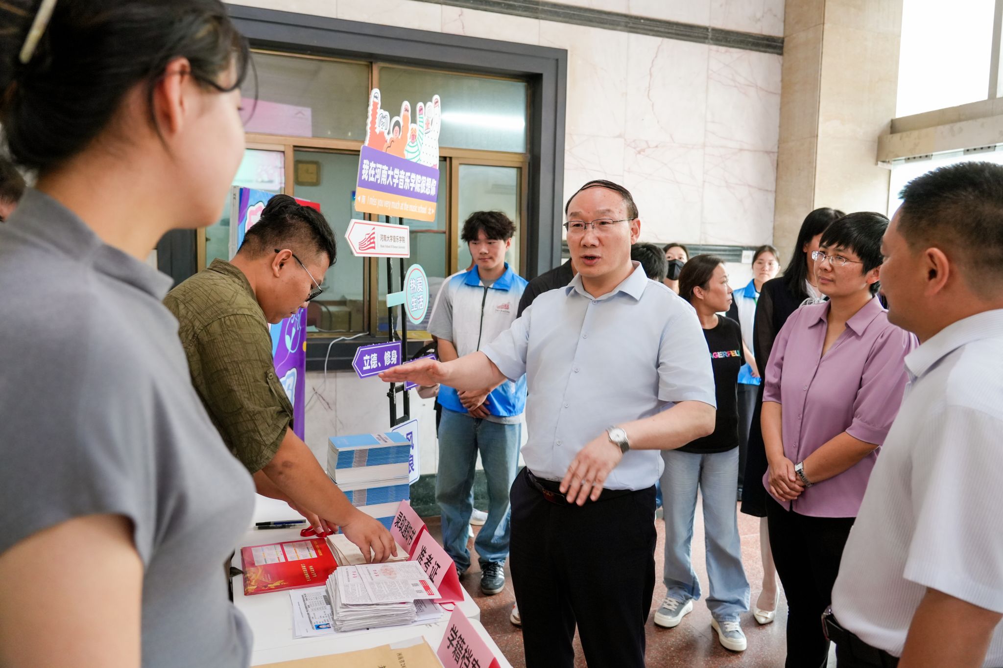 在龙子湖校区,校领导分别走进化学与分子科学学院、能源科学与技术学院、纳米科学与材料工程学院、人工智能学院及新闻与传播学院,实地体验了人工智能学院无纸化报到系统,切身感受了能源科学与技术学院贴心化服务,深入了解新闻与传播学院富有活力的社团文化氛围,对各学院结合学科专业特色推出的创新举措和温馨服务给予高度评价。“一定要对咱们学生好,他们是河大的未来!”检查过程中,张校长再三叮嘱,这句饱含温情的话语,化作一份无微不至的关怀,成为了迎接新生们最温暖的“见面礼”。