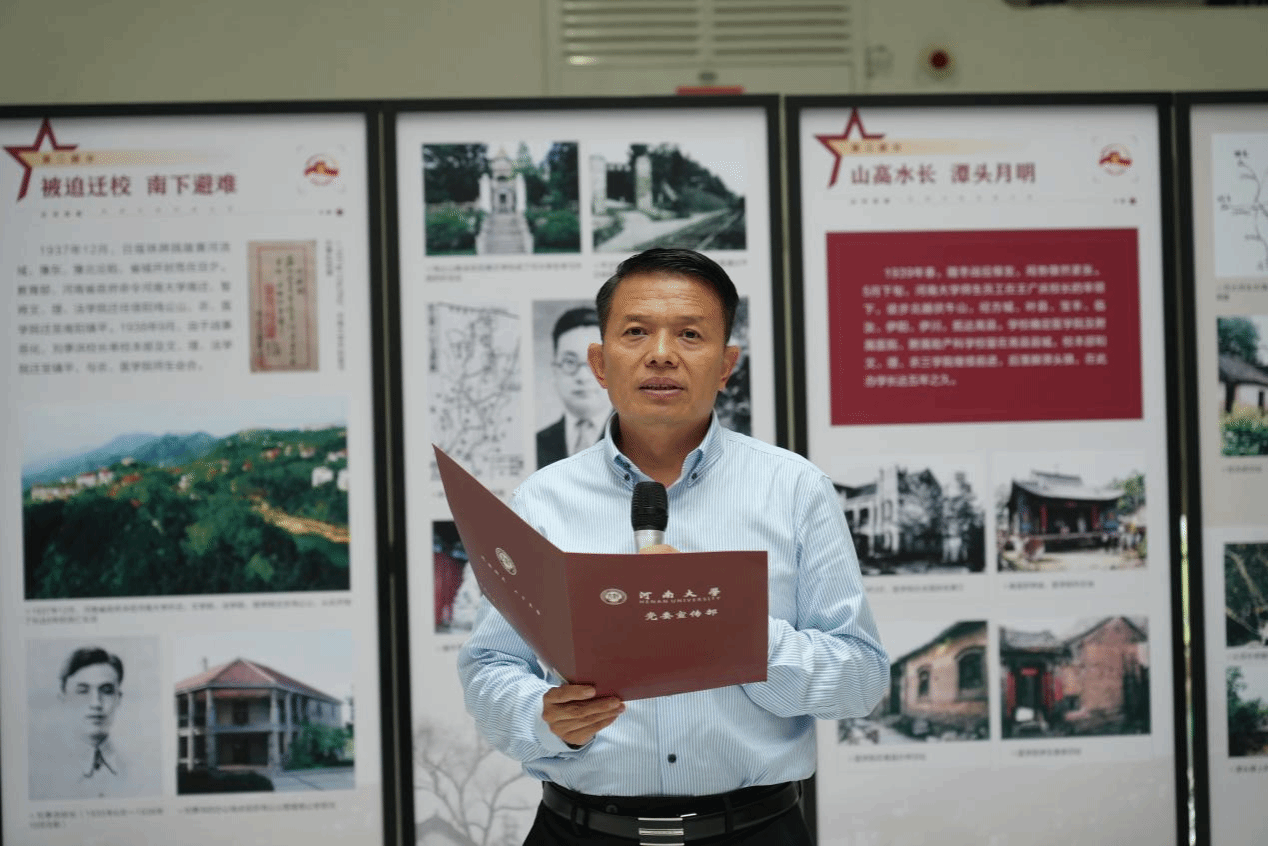 杨萌芽介绍了此次图片展的整体情况。他表示,学校围绕弘扬抗战办学精神,谋划“七个一”专项活动,即开展一系列理论学习活动,创排一个校史情景剧,拍摄一部专题纪录片,举办一场专题图片展,刊发一系列宣传文章,举办一场合唱比赛,推出一系列专题短视频等。此次展览是“七个一”专项活动的重要组成部分之一,展览内容共分为五个部分,通过34块展板、200余幅珍贵历史图片,系统展现了抗战时期河南大学师生辗转多地坚持敌前办学、培育人才的艰辛历程,生动体现了河大人与国家共命运、与时代同奋进的精神风貌。