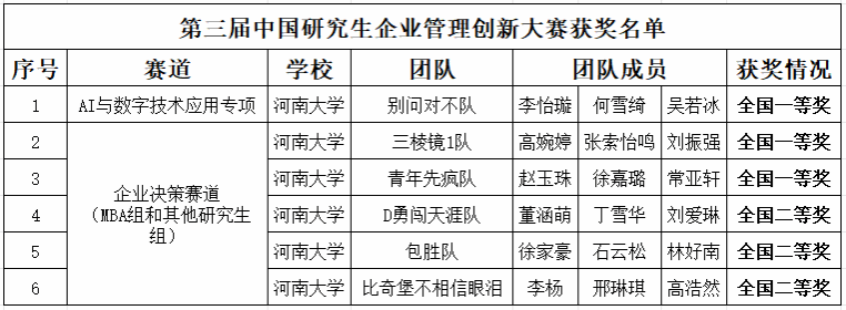 此次赛事的丰硕成果,既是对我校研究生培养质量的检验,也充分彰显了学科竞赛育人体系的建设成效。未来,商学院将继续以“自信、拼搏、开放、创新”的新河大精神为指引,恪守“明德弘道,商善天下”的院训,持续深化研究生创新实践平台建设,着力培育具备系统专业能力与创新应用素养的高素质管理人才,为服务学科建设与高质量发展提供坚实人才支撑。