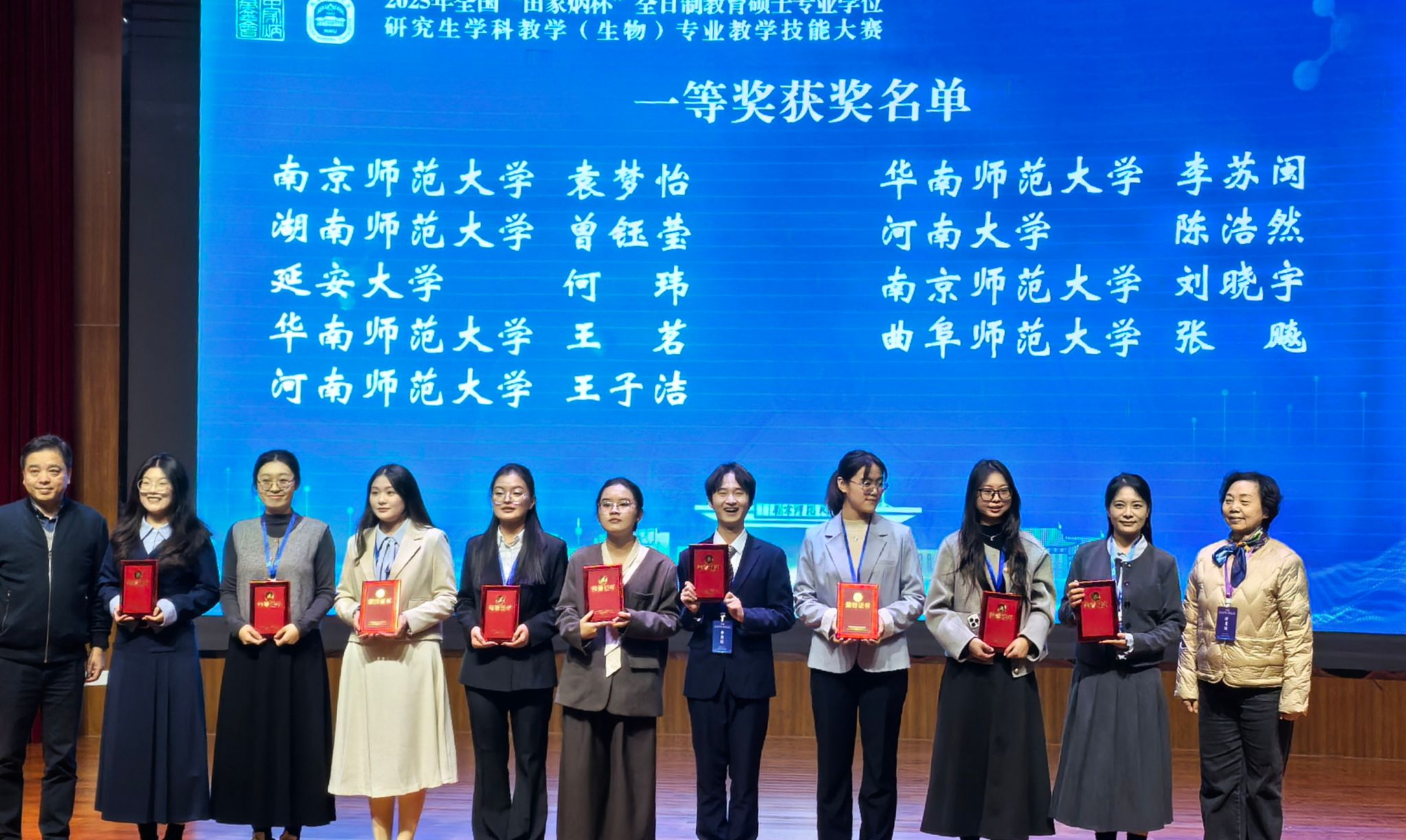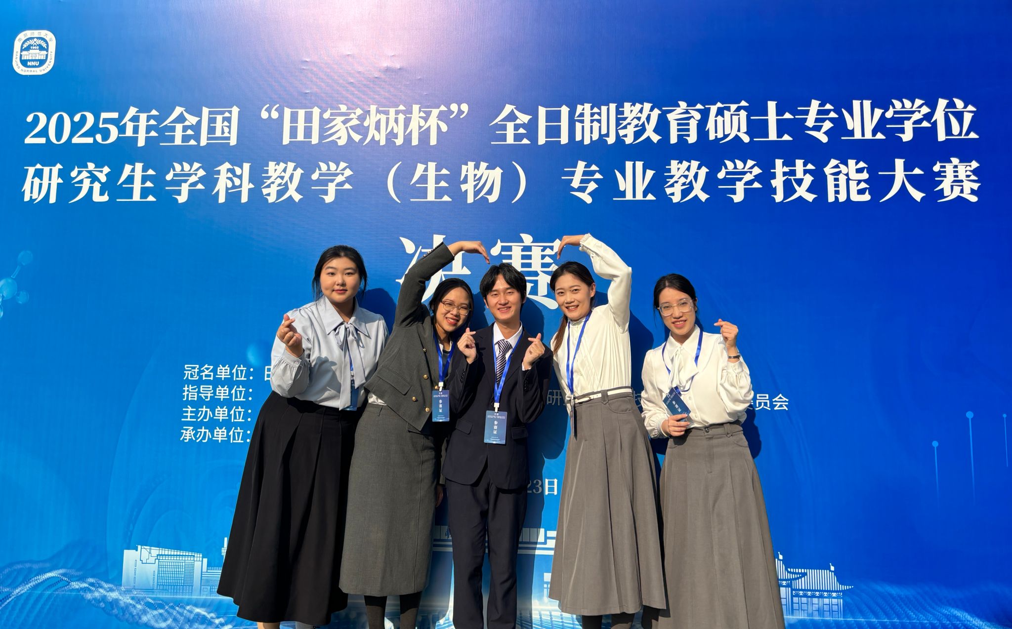 11月22日,2025年全国“田家炳杯”全日制教育硕士专业学位研究生学科教学(生物)专业教学技能大赛在南京师范大学落幕。我校生命科学学院5名参赛选手经过激烈角逐,1人获得一等奖,1人获得二等奖,3人获得三等奖,实现了学院在该项赛事中国赛一等奖的新突破。