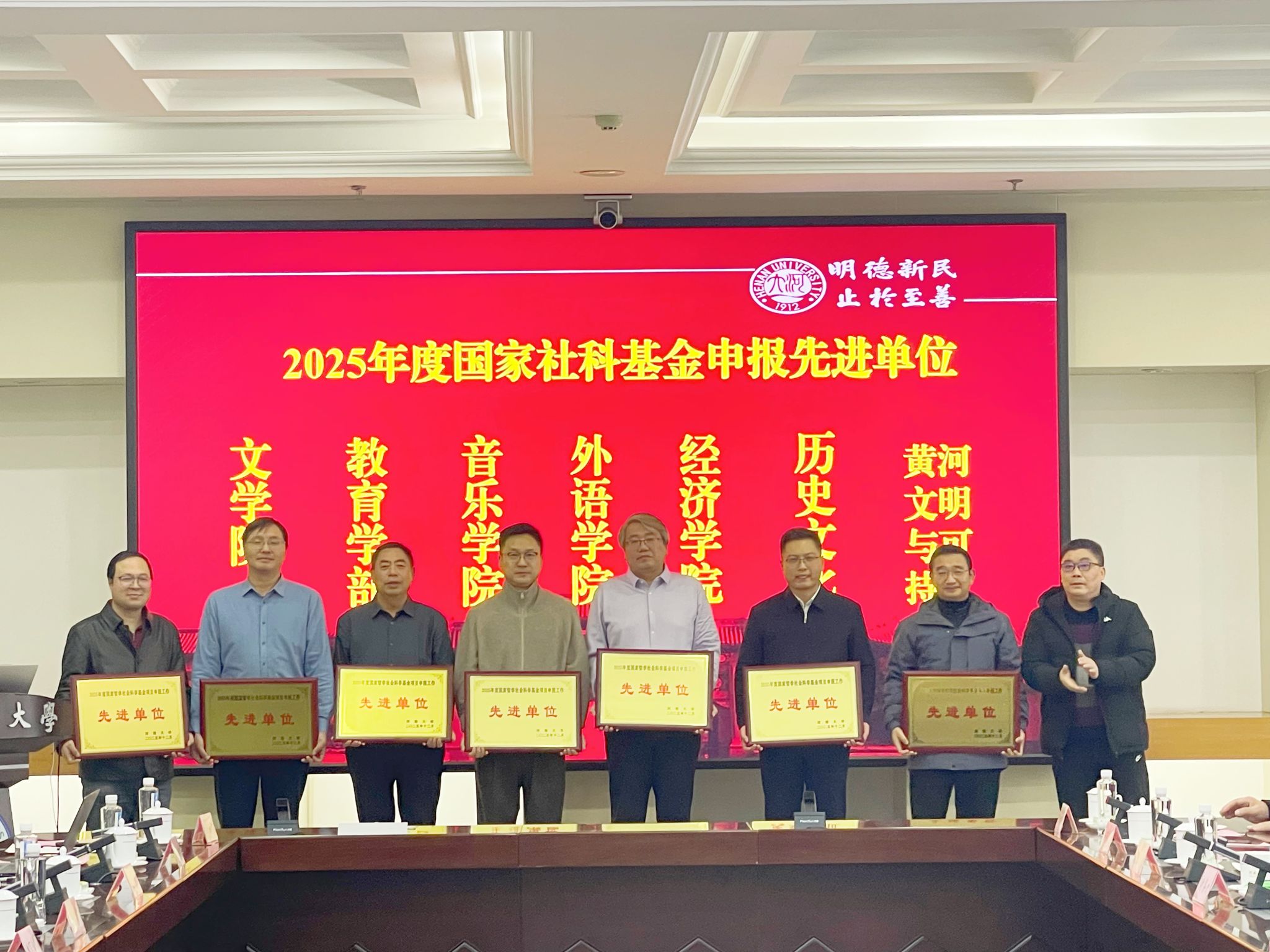 表彰仪式环节,对2025年度国家社科基金项目申报先进单位进行表彰授牌,文学院、教育学部、音乐学院、外语学院、历史文化学院、经济学院、黄河文明与可持续发展研究中心等7家单位获得表彰。
