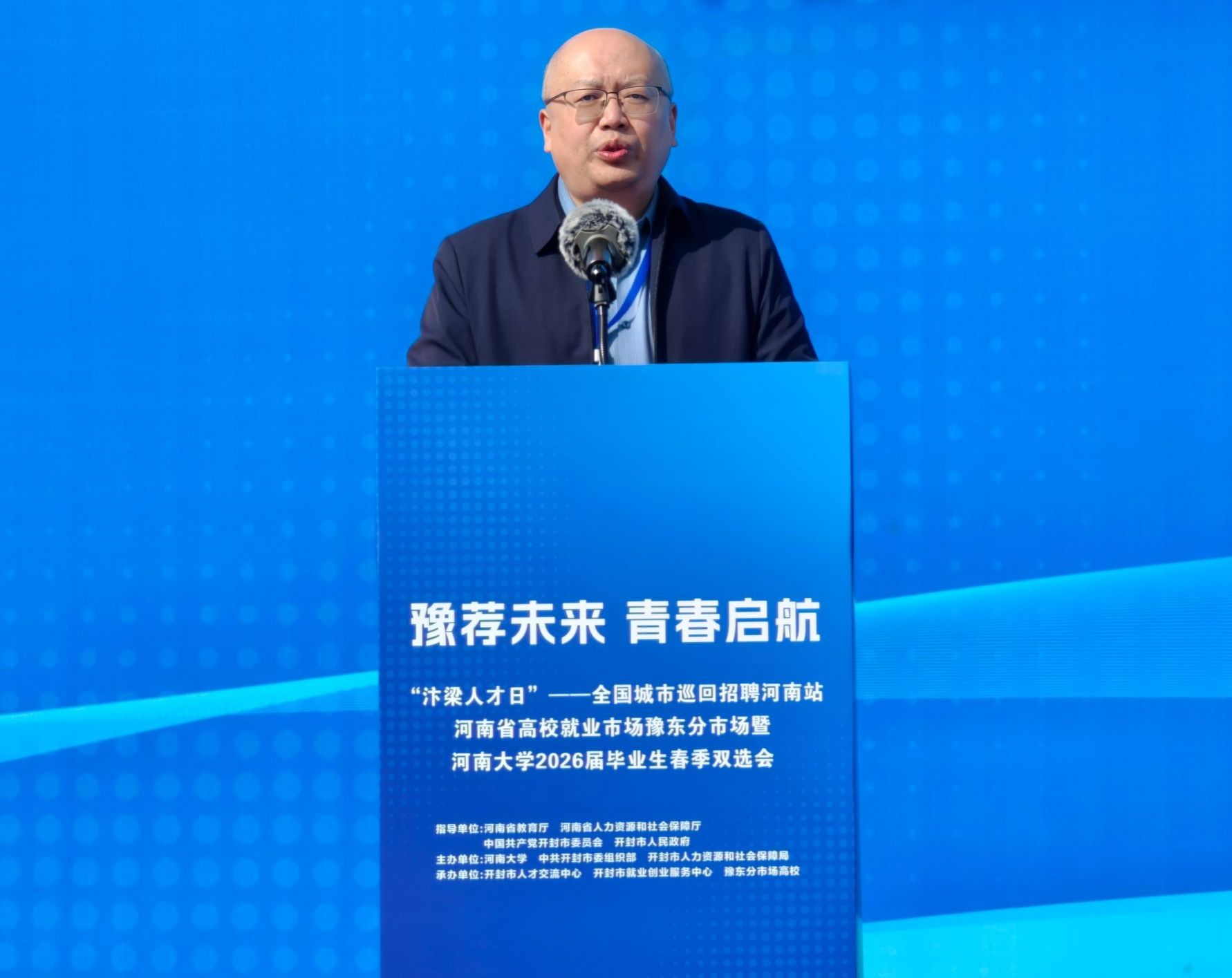 3月29日,由河南省教育厅、河南省人力资源和社会保障厅指导,河南大学与开封市委、市政府联合主办的“豫荐未来 青春启航”“汴梁人才日”——全国城市巡回招聘河南站、河南省高校就业市场豫东分市场暨河南大学2026届毕业生春季双选会,在我校金明校区志义体育场举行。活动现场,副校长薛波出席活动并致辞,开封市委组织部副部长、市委人才办主任陈培鸿,开封市人力资源和社会保障局党组书记、局长于庆等出席,校就业创业指导中心主任张磊主持开幕式,各学院负责就业创业工作的主管领导、毕业年级辅导员全程参与,与广大毕业生一同见证活动启幕,为毕业生求职保驾护航。