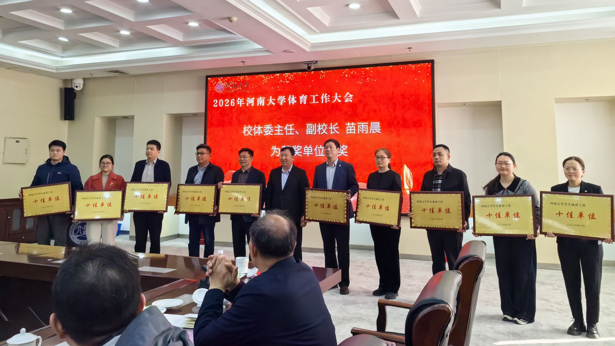 随后,会议审议了《2025年河南大学体育工作报告》《河南大学体质强健计划行动实施方案》和《河南大学健康学校建设行动方案》。校长办公室副主任谢尚萌宣读了2025年度河南大学体育工作十佳单位名单,新闻与传播学院、未来技术学院等十个学院获奖,苗雨晨为获奖单位颁奖。