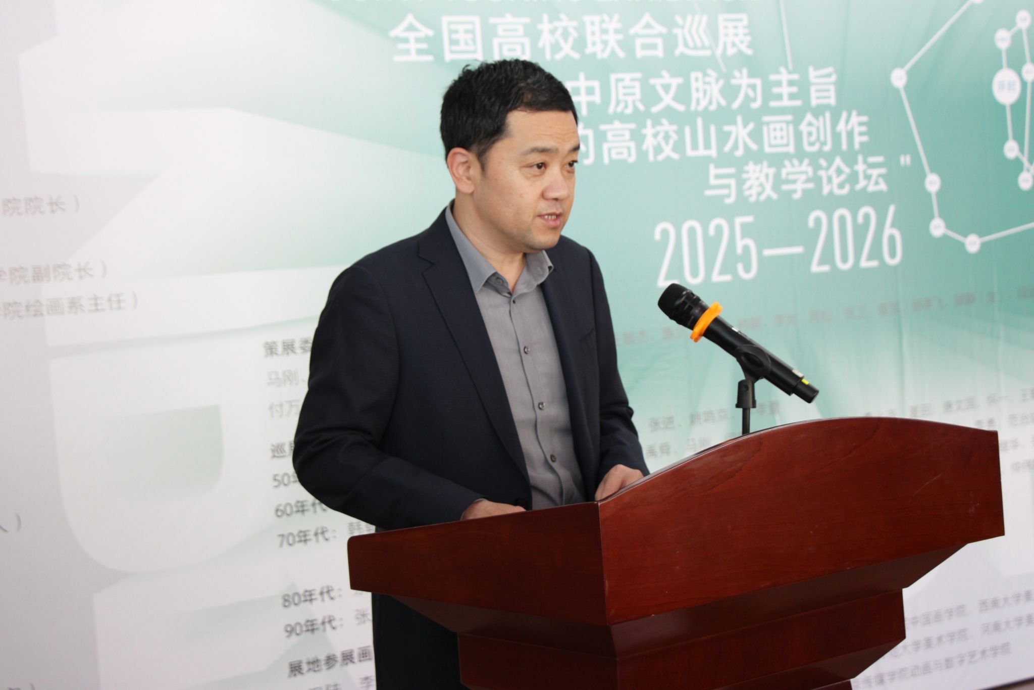 开幕式上,美术学院院长席卫权对各位嘉宾的到来表示欢迎与感谢,并对此次展览的作品进行了介绍。姬志闯表示,本次巡展以中国山水画时代演进为核心,契合传统文艺与时代变迁的学术主旨,系统呈现数十年来传统山水画在当代语境下的传承与创新,为高校师生搭建了学术交流平台。河南大学站作为巡展重要节点,在学术梳理方面,区域内专业界的创作和研究方向高度适配展览主题;在展陈策划方面,特别设置“中原山水意象”专题板块,彰显黄河文明和中原文化对当代山水创作的滋养,回应时代变革的教育诉求,助推山水画艺术人才培养和师资团队建设等学科建设。