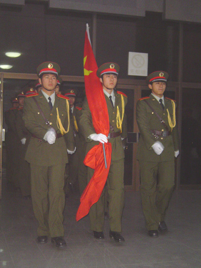 7点左右,24名国旗队员精神饱满,统一军装,排着整齐的队伍,迈着矫健的步伐,喊着嘹亮的口号穿过广场,护卫着鲜艳的五星红旗走向国旗台。7点30分,雄壮的《义勇军进行曲》奏响,护旗手将国旗用力甩起,广场上顿时一片肃静,师生们以及晨练的群众向国旗行庄重的注目礼。仪式结束后,同学们纷纷表示在新的历史条件下,要高举起爱国主义旗帜,铭记历史,胸怀祖国,以国家兴亡为己任,以强烈的社会责任感和历史使命感,为实现中华民族的伟大复兴而努力奋斗!