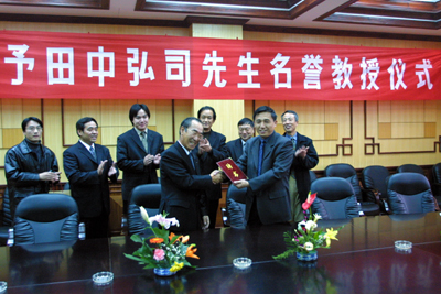 11月26日,日本松下电工驻华总裁田中弘司先生到我校进行友好访问,关爱和校长、黄亚彬副校长等领导在行政楼二楼会议室亲切会见了田中弘司先生。会谈结束后,关校长代表学校向田中弘司先生颁发了名誉教授聘书。