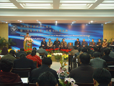 校党委副书记郑邦山在庆典仪式上发表重要讲话。他说,《河南大学报》已走过了70年历程,她忠实地记录了河南大学百年的奋斗史、坎坷史、抗争史和发展史。自20世纪80年代复刊以来,《河南大学报》作为中共河南大学委员会的机关报,严格遵循“团结、稳定、鼓劲、以正面报道为主”的宣传方针,坚持正确的舆论导向,及时传达校党委、校行政的工作部署,承担起宣传教育、上通下达、解疑释惑、维护稳定、促进改革、推动发展的任务,为凝聚人心,营造积极向上的良好氛围,塑造学校的良好形象发挥了重要的作用。今年我校召开的第八次党代会,校党委确立了“两步走”的战略目标,提出建设全国一流大学的宏伟目标,在《河南省建设小康社会规划纲要》中,省委、省政府又一次提出要把河南大学建成全国一流大学。新的形势和任务对我校的新闻宣传工作提出了更高的要求,校党委决定将学校原有新闻资源进行优化整合,将校报、广播站、网站有机结合起来,成立河南大学新闻中心,正是为实现这一目标所做出的积极探索。最后,他还代表校党委对新闻中心的工作提出了四点要求:一、在今后的宣传工作中,始终以“三个代表”重要思想统领全局,坚持以马克思主义新闻观来指导工作;二、要牢牢把握正确的舆论导向,树立为创建全国一流综合性大学宣传工作服务的意识和观念;三、要切实贯彻贴近实际、贴近生活、贴近群众的“三贴近”原则,将校党委与师生紧密联系起来;四、要重视宣传队伍的建设,努力培养出一支政治思想觉悟高、业务素质强,勤于工作、甘于奉献的新闻宣传队伍。