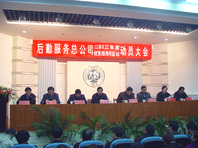 11月13日下午,后勤服务总公司在科技馆二楼报告厅召开2003年优质服务月活动动员大会。副校长史全生同志到会作了重要讲话,后勤服务总公司何喆总经理作了动员报告,总务处莫起升处长、校工会何南峰副主席、校管处李钧处长、校大学生就业指导中心主任崔进军同志、党委宣传部副部长杜富广同志和总公司300余名职工参加了此次动员大会。