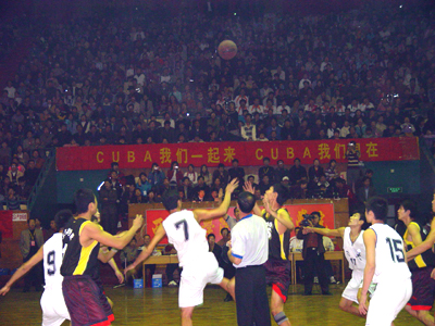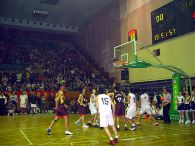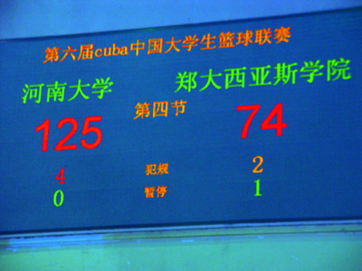 比赛于19:30开始,我校队员一上场便先声夺人,不到两分钟便拿下10分。队员们在场上生龙活虎:巧妙的防守,有力的进攻,使我方连续得分。在第一节结束时,我方比分就超出对方26分。教练孙诚告诉队员要加强防守,多抢拦板,把失误减到最小。第二节开始后,队员们稳步推进,认真防守,继续拉大比分,中场休息时,比分为71:32,超出对手39分,在场的河大球迷兴奋不已。经过短暂的休息调整,我校队员加强了进攻。在下半场比赛中,我方队员以巧妙的传球、默契的配合、精彩的拦板和抢断、绝妙的扣篮,赢得了在场观众的阵阵掌声,连在场的几千名西亚斯拉拉队员也为之赞叹。我队7号中锋王凯,发挥技术优势,一人就拿下40分。最后,我校以125的高分狂超对方51分。