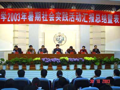 校团委副书记宋菊芳就2003年我校暑期社会实践活动的整体情况进行了总结。她说,2003年我校暑期社会实践活动取得了很大成绩,在重点组织好“大学生防治非典实践服务团”、“革除社会陋习,弘扬文明新风服务团”、“大学生文化支教服务团”和大学生志愿者文化、科技、卫生“三下乡”活动的同时,积极有效地开展了扶贫助教等一系列独具特色的社会实践活动。一个月内,《中国教育报》三次报道了我校暑期社会实践活动的开展情况,中国广播网、《河南日报》、《教育时报》、河南电视台等众多新闻媒体也对我校的暑期社会实践活动进行了全方位的报道,产生了良好的育人效益和社会效益。