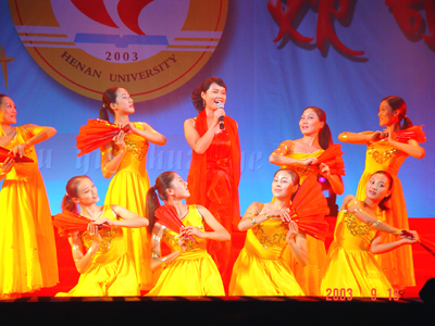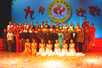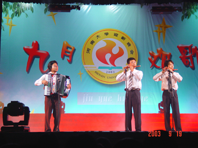为迎接2003级新生,由河南大学校团委和学生工作部联合举办的“九月欢歌”暨河南大学迎新生晚会于9月19——20日晚在大礼堂举行。校党委副书记郑邦山,副校长王发曾以及共青团开封市委的领导和来自全校的新生一道观看了演出。