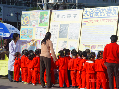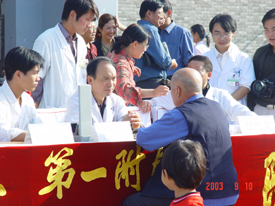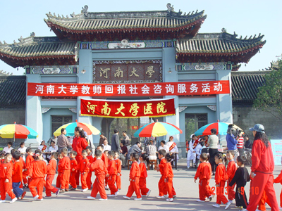 9月10日上午7时多,学校南大门广场,鲜艳的“河南大学教职工回报社会咨询服务活动”的横幅刚刚挂出,校医院的义诊桌、义诊牌已经一字排开,医护人员忙着为前来义诊的群众检查。广场中间,身着盛装的附小军乐队鼓号震天,被数百名一袭红装的幼儿簇拥着,给节日的河大广场增添了洋洋喜气。