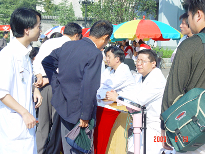 8时30分,参加咨询义诊的单位全部到位。有校医院、东京医院、淮河医院的专家义诊;医学院、药学院、护理学院、制药厂的专家咨询用药指南、医学法规、护理知识等方面的常识;有学生处、招生办、艺术附中、成教院、附小、幼儿园等单位的勤工助学、学生贷款、毕业生就业、招生、入学、入托咨询;有教育科学学院的儿童教育、心理健康咨询;有法学院婚姻法、刑法、民法等方面的法律咨询;有后勤服务总公司的免费理发服务;有文学院、化学化工学院、外语部、计算机学院、土木建筑学院、哲学与公共管理学院、工商管理学院、马列德育部的事业成果展示和专业特色介绍。整个活动现场气氛热烈,群众被教工们回报社会的热情感动着,就连半月以来从不露面的太阳也热情地烘托着气氛,烤得大家汗流浃背。