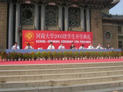 大会由副校长王发曾主持。雄壮的国歌声后,党委副书记郑邦山代表学校宣布了2003级新生奖学金获得者的名单,鼓励29名奖学金获得者,并号召同学们向他们学习。接着关爱和校长代表学校党政领导和教职工发表了热情洋溢的讲话,他对8000余名新同学能在中秋佳节这美好的日子里团聚表示衷心地祝福,他还介绍了我校的校史、校况,鼓励同学们在河大园这片教书育人的沃土、读书成才的地方发奋图强,早日成为祖国的栋梁之材。他的精彩讲话博得了同学们雷鸣般的掌声。教师代表和老生代表,也对2003级新同学的到来表示热烈的欢迎和真诚的祝福,希望他们在即将开始的大学生活中学习好、工作好、生活好。新生代表则代表全体新生表达了他们要用年轻的心,年轻的生命谱写华彩乐章,为河大增光的决心。他的发言引起了新同学的强烈共鸣,博得了阵阵掌声。开学典礼在雄浑的校歌声中圆满结束。
