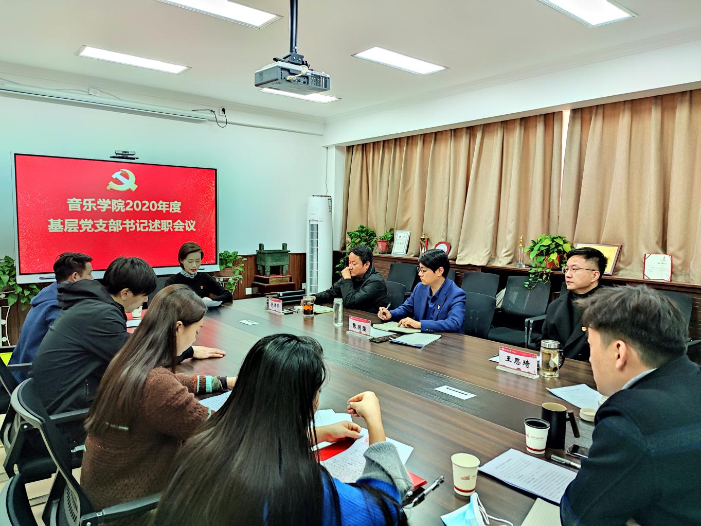 1月14日下午,音乐学院2020年度基层党支部述职大会在学院党建活动室举行。院党委书记张国强,党委副书记、院长王思琦,党委副书记党鸿军以及全体党支部书记参加会议,张国强主持会议。