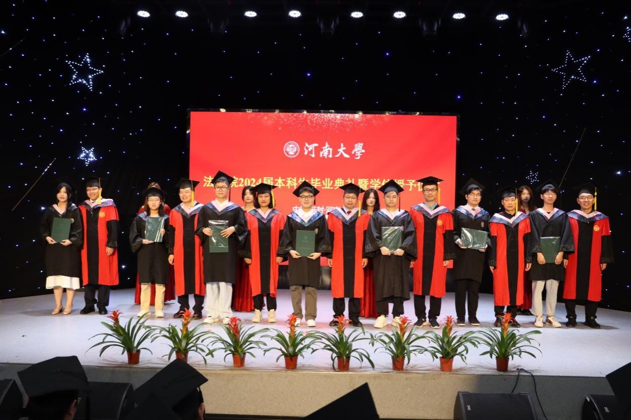 副院长刘夏宣读《关于授予法学院2024届本科毕业生学士学位的决定》。法学院学位评定分委员会成员和教师代表为2024届本科毕业生援正流苏、颁发学位证书。