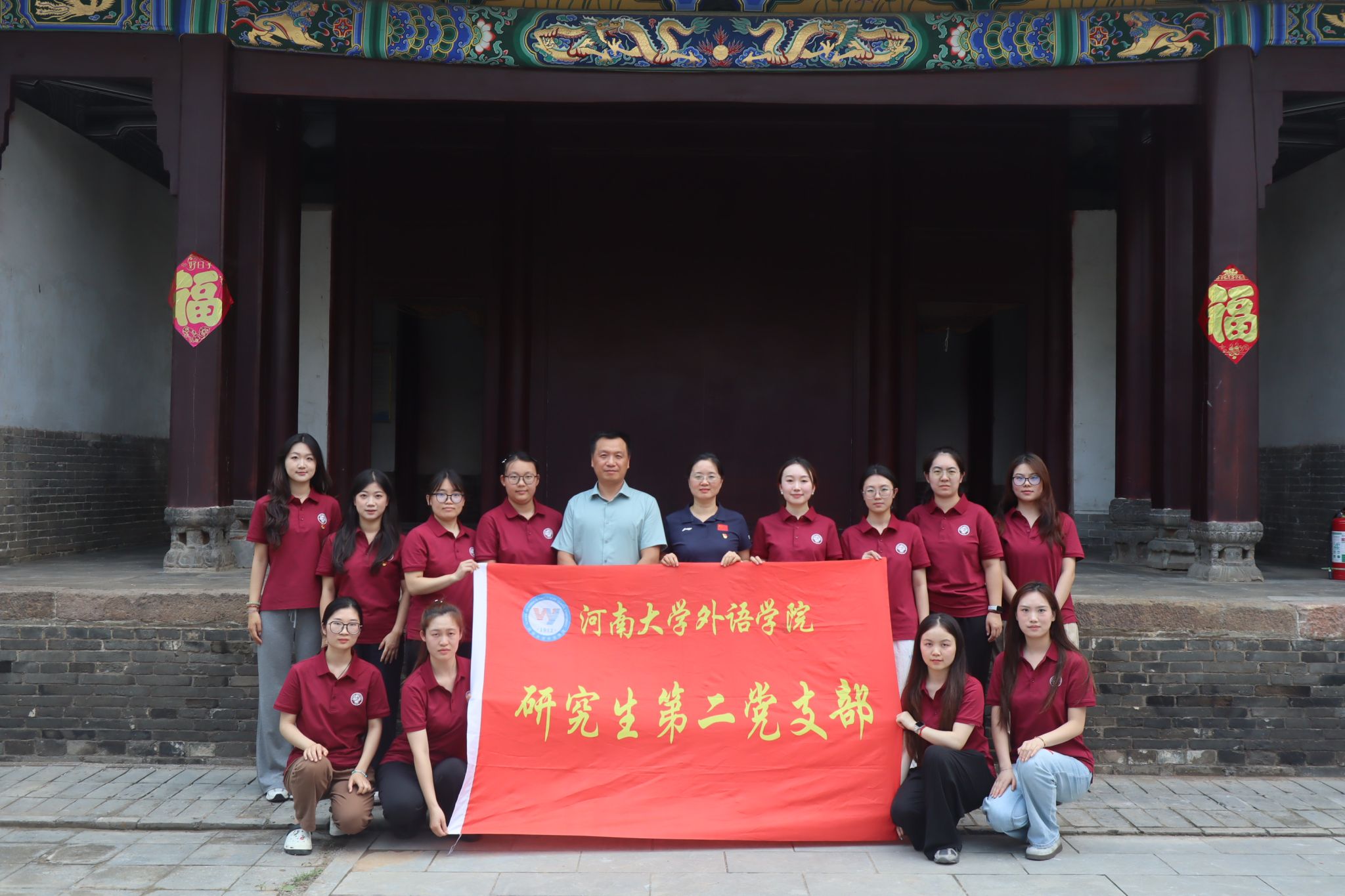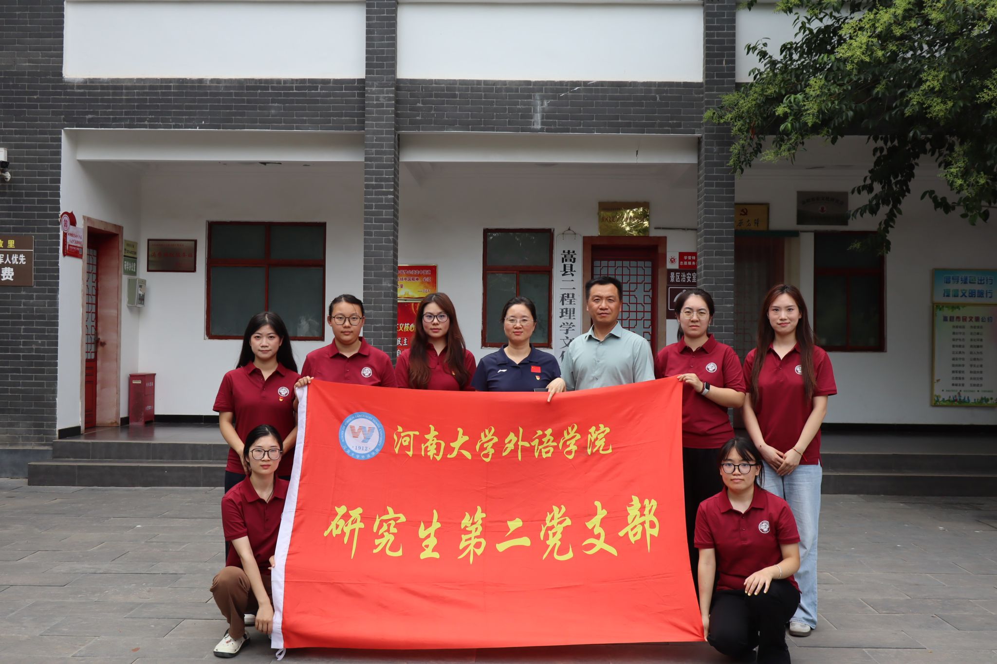 为深入传承红色基因,弘扬河大精神,强化党员责任担当,外语学院研究生第二党支部成立薪火征途实践队,赴嵩县黄庄乡开展为期一周的实践活动。7月10日,实践队从黄庄乡出发,赴嵩县城关镇财神庙河南大学抗战办学旧址、两程故里家风基地,通过实地参观、聆听讲解、沉浸宣讲、互动交流等形式,开展“赓续红色血脉,传承河大精神”主题党日活动。外语学院党委书记王玉珍、党委办公室主任许磊、研究生第二党支部书记郭琰以及实践队全体成员参加活动。
