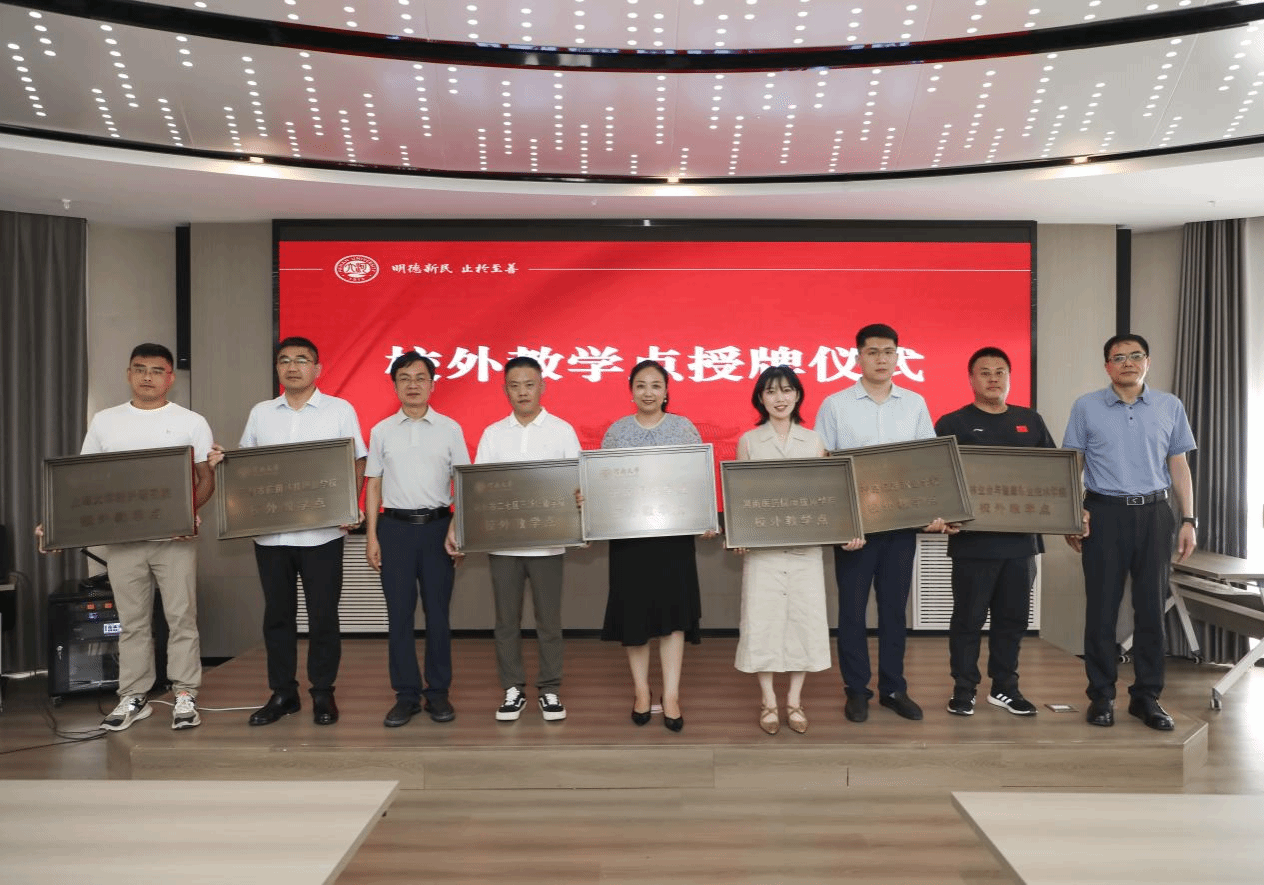 会上举行了校外教学点授牌仪式。袁凯强与韦胜军共同为经省教育厅备案的青岛绿泽职业学校、上海大学绍兴研究院、桂林生命与健康职业技术学院、郑州市二七区三新培训学校、开封市应用科技职业学校、河南医药健康技师学院、中原科技学院等7个校外教学点授牌。