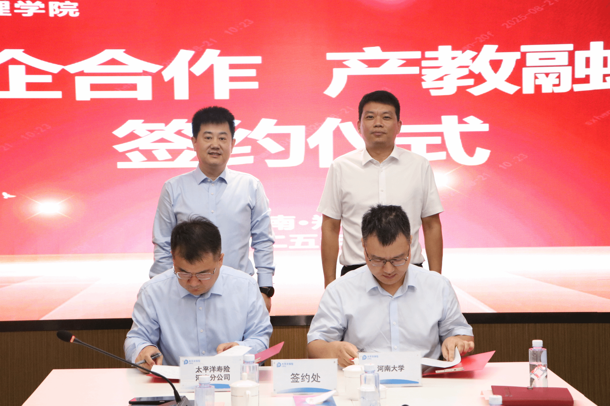 8月21日上午,经济学院与太平洋寿险河南分公司签署战略合作协议。此次签约活动由河南省保险学会搭建平台,河南大学、河南财经政法大学、郑州航空工业管理学院共同开展校企合作活动。签约仪式在太平洋寿险河南分公司举行,河南省保险学会会长昝慧静、河南大学经济学院党委书记程金辉、河南财经政法大学金融学院院长赵紫剑、郑州航空工业管理学院经济学院党委书记贺琼、太平洋寿险河南分公司总经理马继伟出席签约仪式。