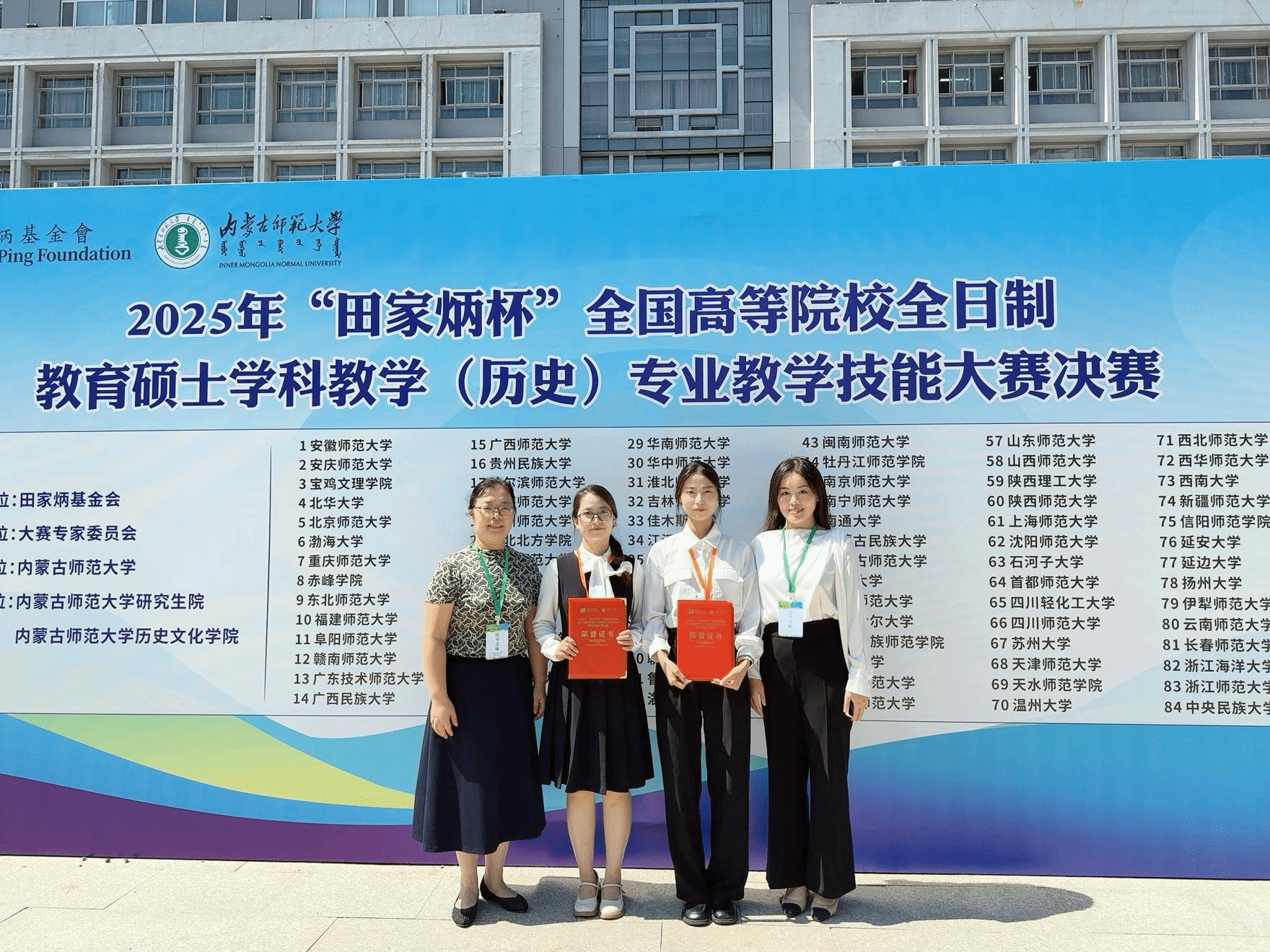 8月22日—26日,2025年全国“田家炳杯”全日制教育硕士专业学位研究生学科教学(历史)专业教学技能大赛在内蒙古师范大学落下帷幕。历史文化学院谢佳芮副教授带队,学院2023级与2024级学科教学(历史)专业硕士研究生张淼、李梦茹分获一等奖、三等奖并同获“优秀教学设计奖”,指导教师黄俊华副教授荣获“优秀指导教师奖”。