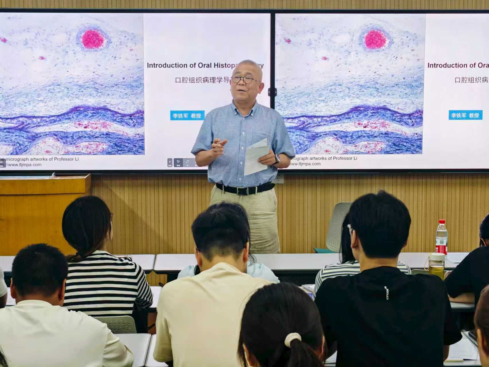 9月2日晚,李铁军教授为2023级本科生讲授《口腔医学英语》,课堂上,围绕活检诊断标准的全英文辩论正酣。李教授以患者身份抛出临床难题:"当冰冻切片结果与临床判断相左时如何抉择?"这种沉浸式教学法,引导学生综合运用文献研判、病理分析和伦理评估能力。课程精选的《Histopathological diagnosis of oral diseases》文献,被创新转化为临床决策的思维训练模块。有学生感慨:"这堂课赋予我们的,是专业语言与临床思维的双重武器库。"