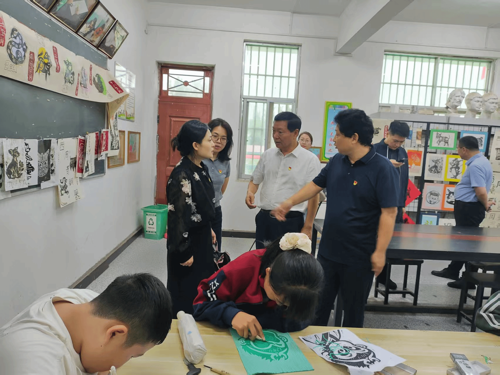 韩冰一行首先来到水黄村小学,实地察看了省教育厅援建的水黄小学办学情况,向辛勤耕耘在教育一线的老师们传达了厅领导的深切关怀,提前致以教师节的问候,并向学校赠送了一批办公用品和图书。大家参观了水黄村小学版画社团活动室,与正在制作版画的孩子们进行了深入交流。省教育厅派驻尉氏县邢庄乡水黄村第一书记贾祎祺同志向大家介绍了水黄小学版画社团的组织形式、突出特色与面临困难,韩冰同志表示省教育厅将携手河南大学对水黄小学高质量发展提供更大的支持。