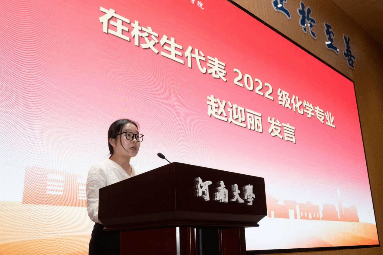 曾荣获国家奖学金、国家励志奖学金、多项学科竞赛国家级奖项以及“三好学生”等多项荣誉称号的2022级化学专业二班的赵迎丽,作为高年级学生代表发言。她回顾自己大学三年在实验室钻研、参与创新项目和竞赛等经历,分享成长感悟,并对新生提出三点建议:明确目标、做好规划;走出舒适圈、在历练中成长;涵养积极心态。最后,祝愿新生在河大书写无悔青春。