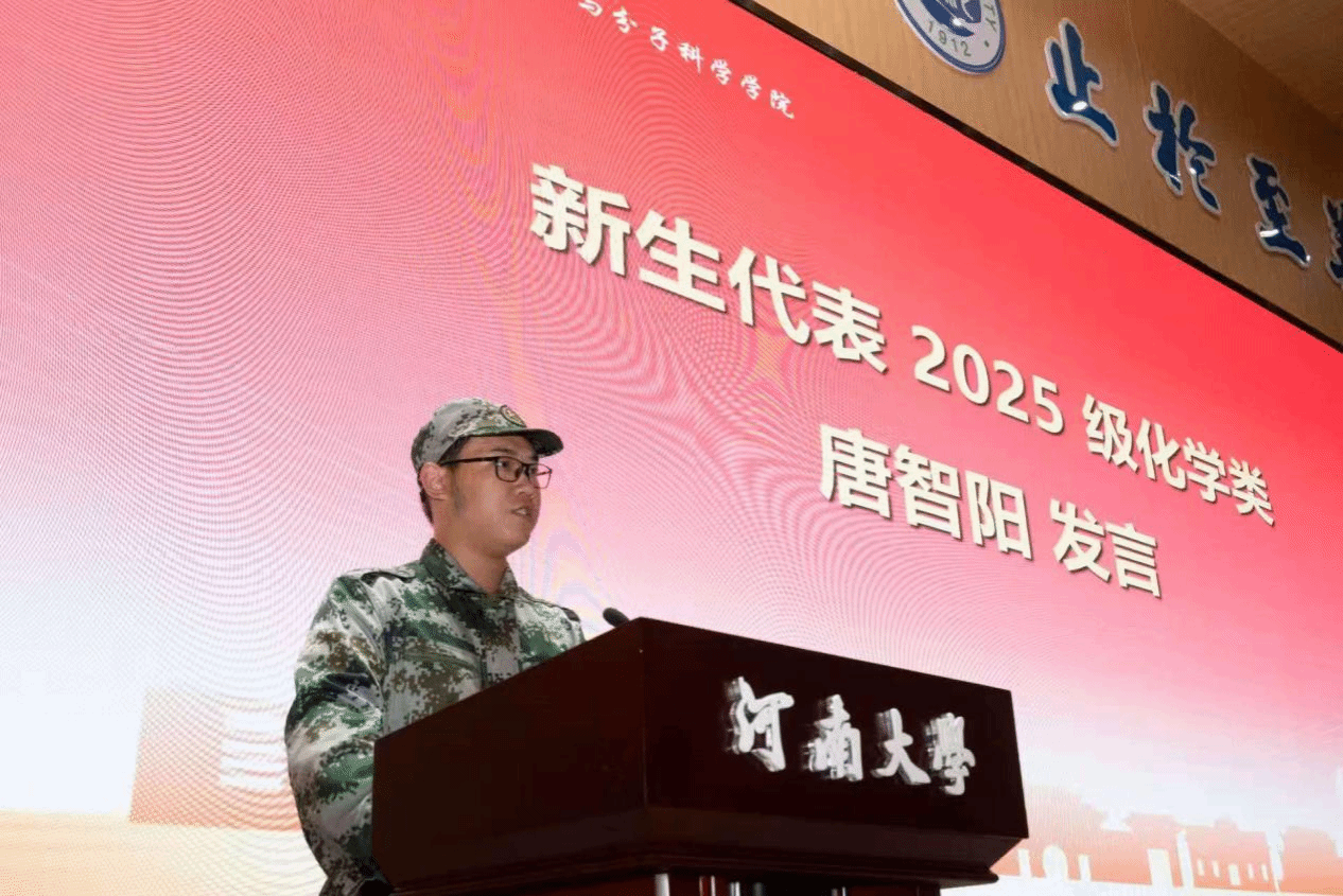 2025级新生代表唐智阳发言时,首先向父母、师长与同学表达敬意与感谢。随后浅谈“明德新民,止于至善”校训和“自信、拼搏、开放、创新”新河大精神对他们大学生活的引领和指导意义,并表达了与同学们共同成长成才的期待。最后他代表新生表态,他们已做好迎接人生新阶段准备,要争做时间的雕刻家、温暖的传递者、时代的答卷人,在大学期间砥砺前行、淬炼成长,书写青春华章。