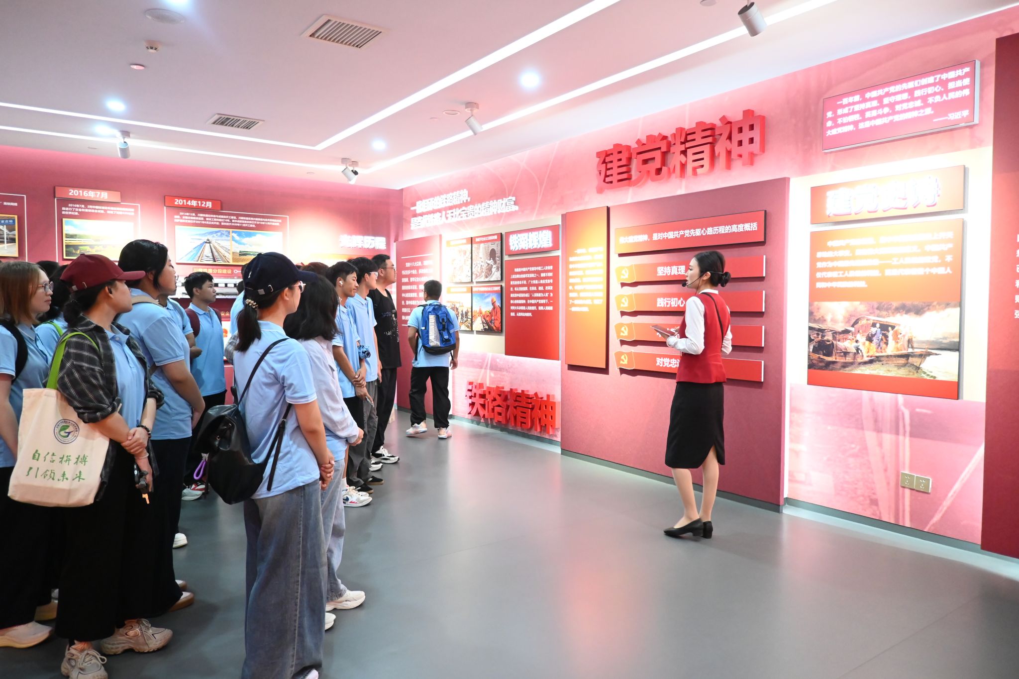 在河南省铁路建设投资集团展厅,讲解员带领学生系统回顾了中国铁路从无到有、从弱到强的奋斗历程,重点学习了铁路系统在党的领导下服务国家战略、保障国民经济发展的辉煌成就。一段段感人至深的铁路红色故事——如“二七”大罢工中工人阶级的强大力量、成昆铁路建设者们的牺牲奉献、高铁自主创新中的科技攻坚,生动诠释了一代代铁路人坚定信念、艰苦奋斗、报效祖国的优良传统。同学们认真学习了伟大建党精神,认识到科学技术是第一生产力的深刻内涵,感受到中国共产党的伟大。