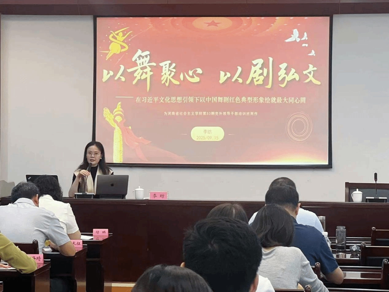 9月15日,我校台联会长、戏剧学院副院长李昉教授受邀为河南省社会主义学院第53期党外领导干部培训班(秋季主体班)作题为《以舞聚心 以剧弘文——在习近平文化思想引领下以中国舞剧红色典型形象绘就最大同心圆》的专题辅导。