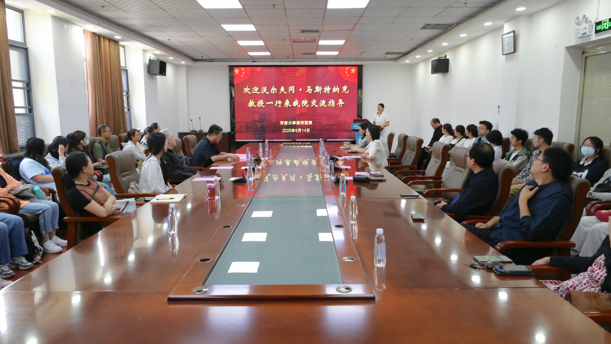 9月14日,中国(西太平洋地区)慢性心脏疾病长期康复与艺术治疗河南分中心揭牌仪式暨国际学术交流会在淮河医院举行。国际知名艺术治疗专家沃尔夫冈·马斯特纳克教授(Wolfgang Mastnak)、上海同济大学医学院附属第十人民医院的杨建设教授一行来访并开展学术交流,淮河医院院长、党委副书记、第二临床医学院(淮河医院)院长左克强,第二临床医学院(淮河医院)副院长石贞玉,第二临床医学院(淮河医院)副院长马静,以及康复医学科、心血管内科等多个临床科室负责人与硕士研究生共同参会。会议由石贞玉主持。