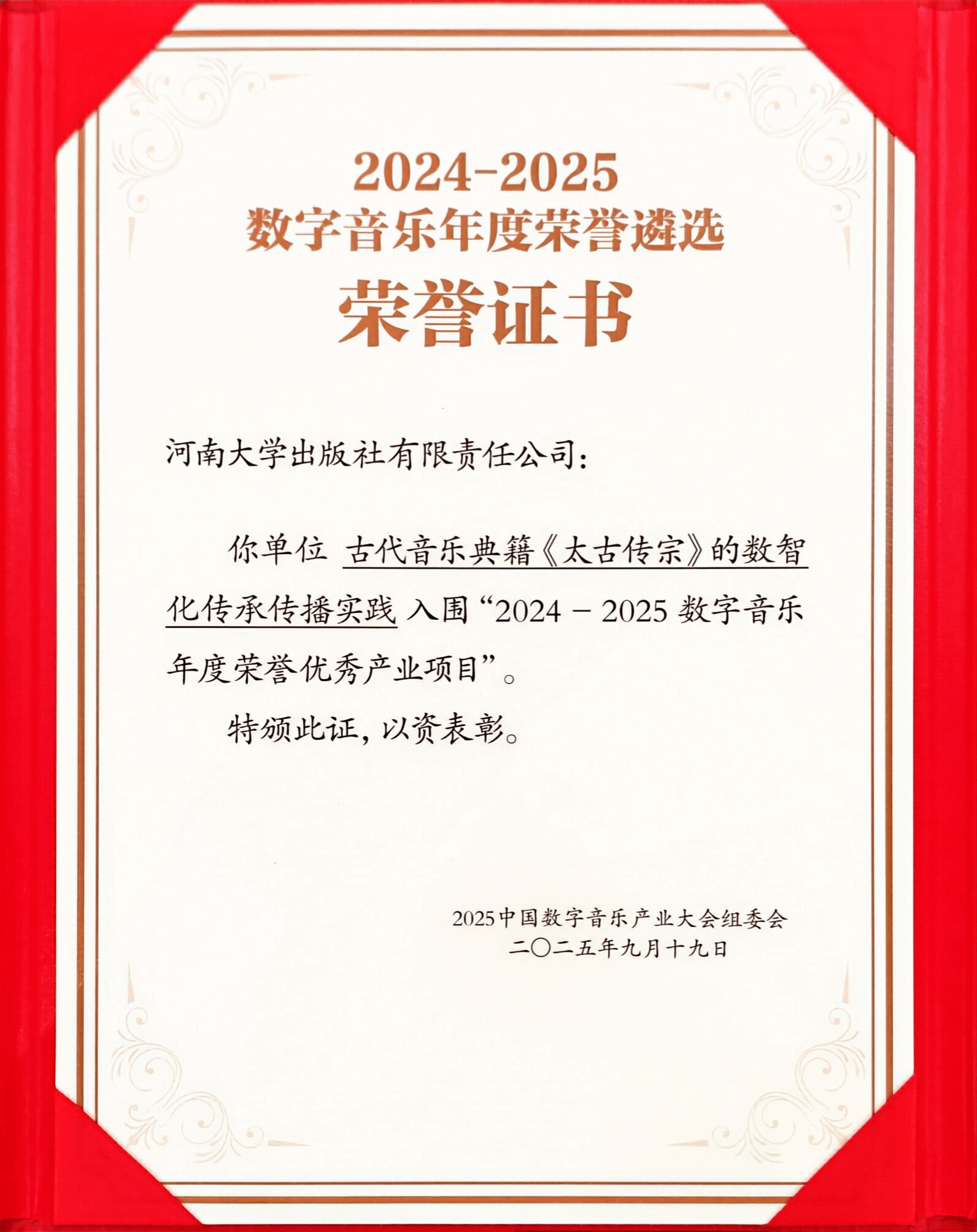 作为本次大会的重要环节,“2024—2025数字音乐年度荣誉遴选”旨在表彰在数字音乐领域具有创新性、示范性与影响力的优秀产业项目。我校出版社申报的“古代音乐典籍《太古传宗》的数智化传承传播实践”项目,凭借对传统音乐典籍的深度挖掘与数智化转化,从众多参评项目中脱颖而出,成功入围优秀产业项目。