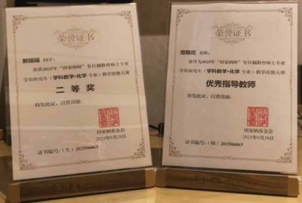 经过激烈角逐,化学与分子科学学院2024级学科教学(化学)专业硕士研究生郭瑶瑶凭借扎实的专业基础、出色的教学设计与稳定的现场发挥,荣获大赛二等奖,其指导教师范艳花被评为优秀指导教师。