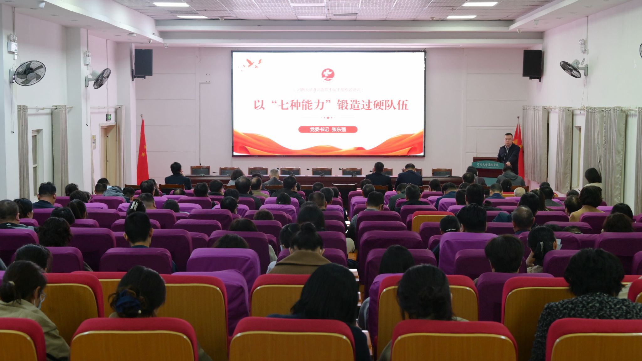 张东强围绕习近平总书记在2020年秋季学期中央党校中青年干部培训班开班式上提出的“七种能力”——政治能力、调查研究能力、科学决策能力、改革攻坚能力、应急处突能力、群众工作能力、抓落实能力,系统阐释了其时代背景、核心内涵与实践路径。他表示,在当前“百年未有之大变局”与“中华民族伟大复兴战略全局”交织的复杂形势下,面对学校确立“强理振文、新工新医”办学新主线与创新发展路径的新历史机遇,提升“七种能力”是干部应对挑战、担当使命的必然要求,也是推动医院高质量发展、加快建设“研究型医院”的重要保障。