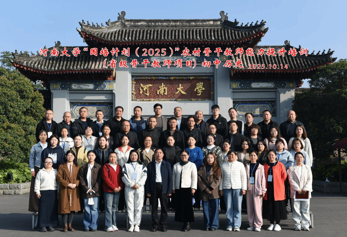 全体与会成员在河南大学南门合影留念。此次“国培计划(2025)”农村骨干教师能力提升培训(省级骨干教师项目)初中历史培训班的开班仪式,为培训活动揭开了序幕。此举激励全体参训教师在学习实践中不断精进,提升历史教学能力与水平,将更高水平的教育“答卷”书写在祖国乡村的大地上。