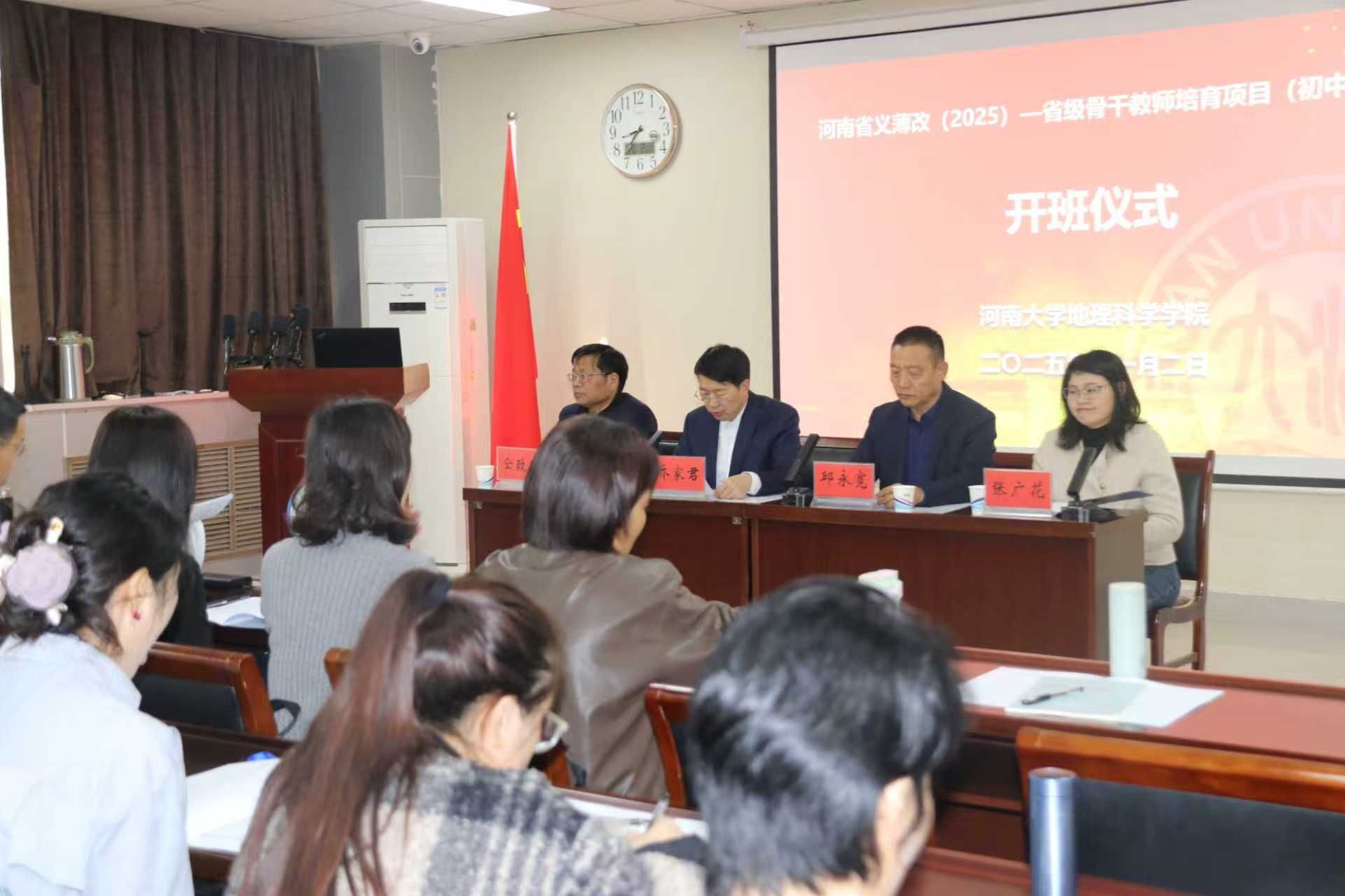 11月2日上午,2025年义务教育师资薄弱环节改善暨中小学教师素质提升工程---省级骨干教师培育项目(初中地理)培训班开班仪式在地学楼215报告厅举行,地理科学学院党委书记乔家君、副院长邱永宽、学科教学硕士生导师张广花、继续教育中心主任仝致琦以及培训班全体学员参加。开班仪式由邱永宽主持。