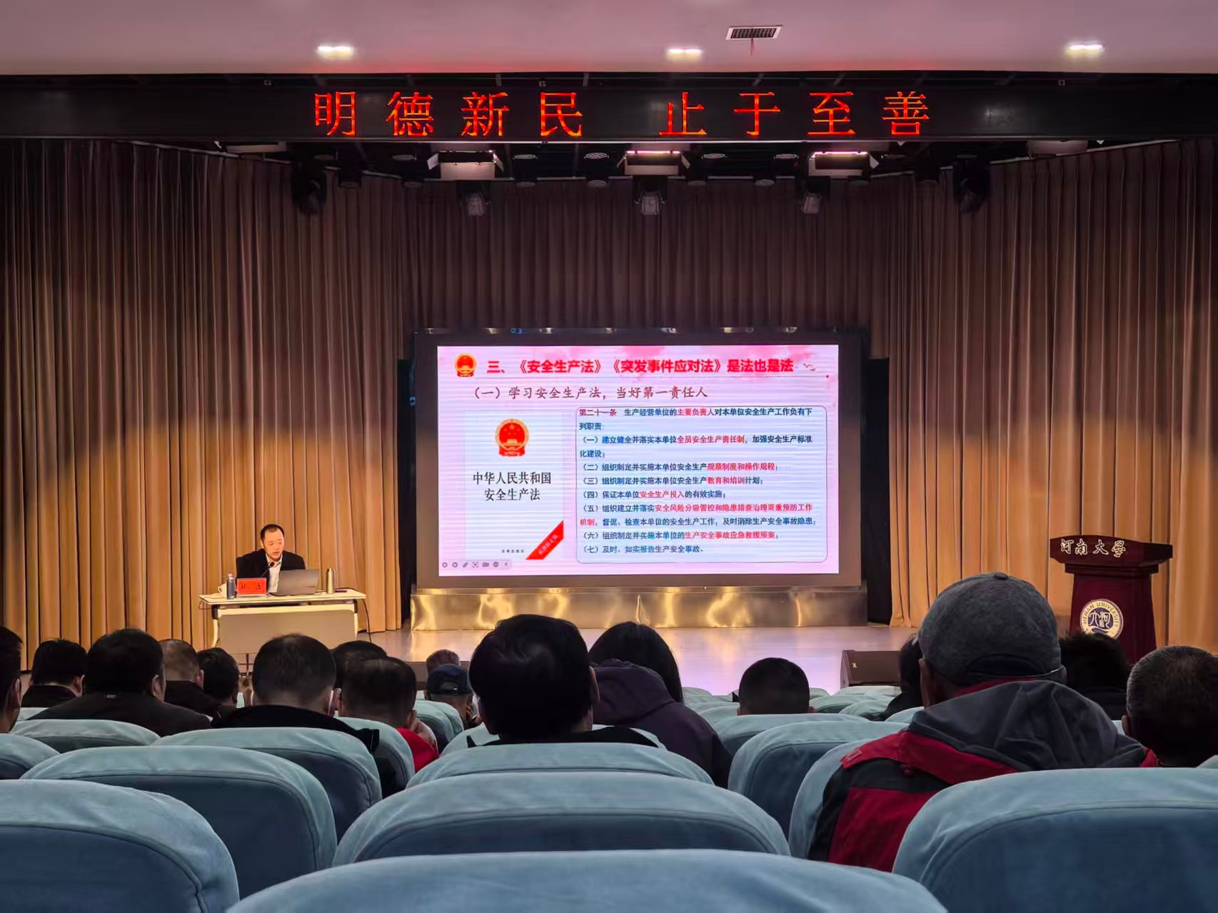 为深入贯彻落实习近平总书记关于安全生产的重要论述,进一步提升职工安全生产意识与应急管理能力,夯实校园安全发展基础,11月5日上午,后勤保障部党委在明伦校区逸夫科技馆学术报告厅举办安全生产与应急管理专题培训。河南省应急管理厅人事处处长靖磊应邀作专题报告。后勤保障部党委、总务处(后勤集团总公司)、保卫处、基建处全体领导班子成员及全体人员参加培训。讲座由党委常务副书记张亚歌主持。