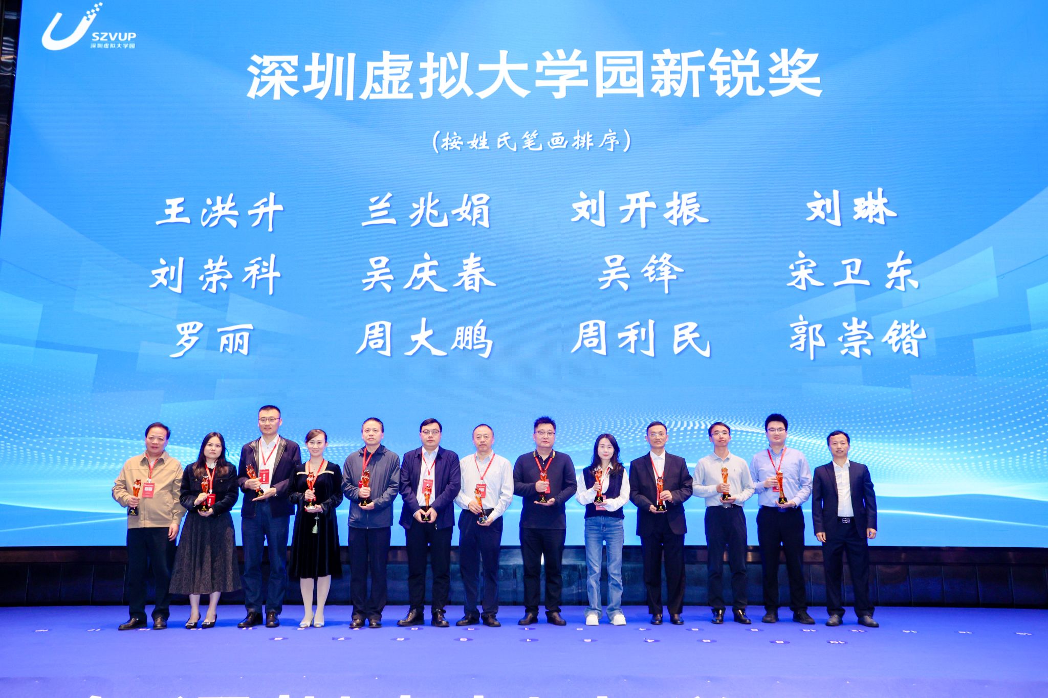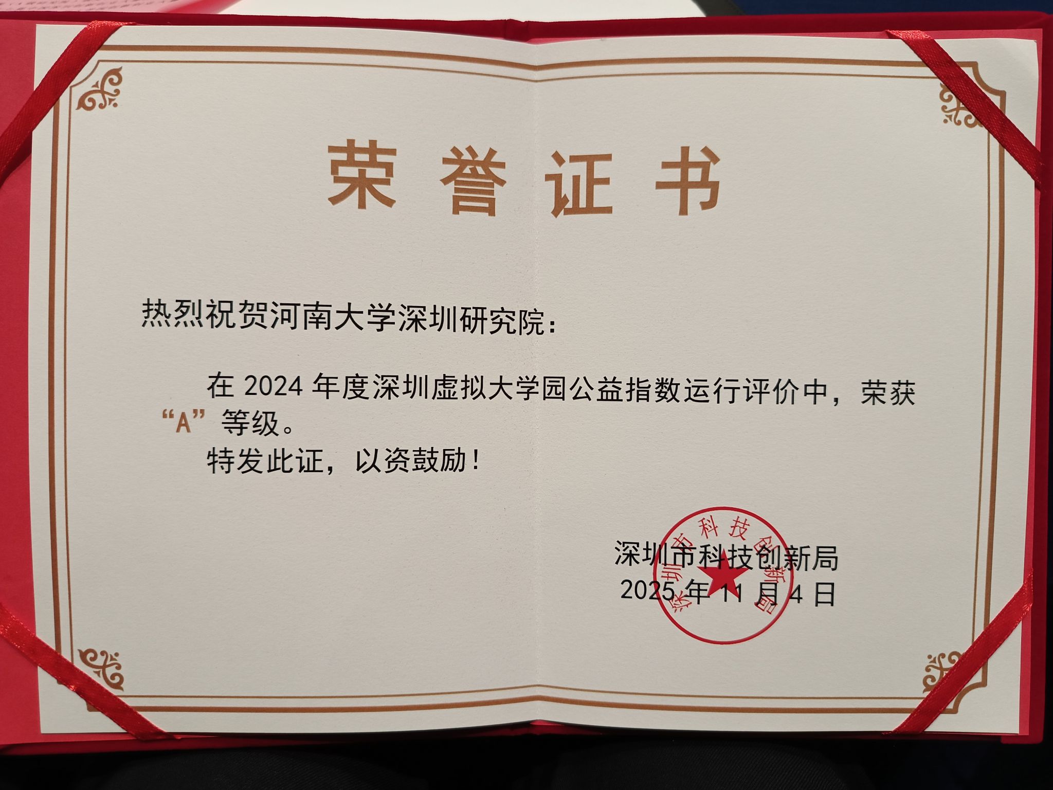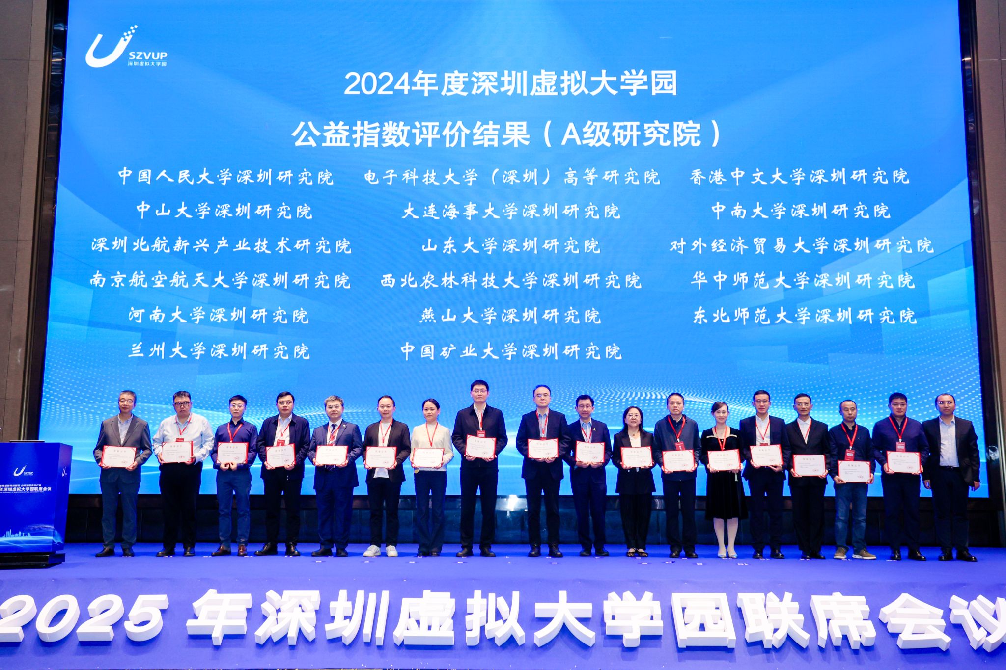 会议期间,深圳市科技创新局对在2024年度深圳虚拟大学园成员院校深圳研究院公益指数运行评价中获评“A”等级的研究院予以表彰,河南大学深圳研究院获评“A”级,首次进入第一梯队,周大鹏教授代表研究院上台领奖。该评价工作由中共深圳市委机构编制委员会办公室联合深圳市科技创新局组织实施,全面考量深圳虚拟大学园各成员院校深圳研究院在科学管理、公共服务和运行效益等方面的综合表现。经两轮专家评审及复核,最终确定A级名单。同时,学院牛利民、周大鹏两位老师获得深圳虚拟大学园“新锐奖”。