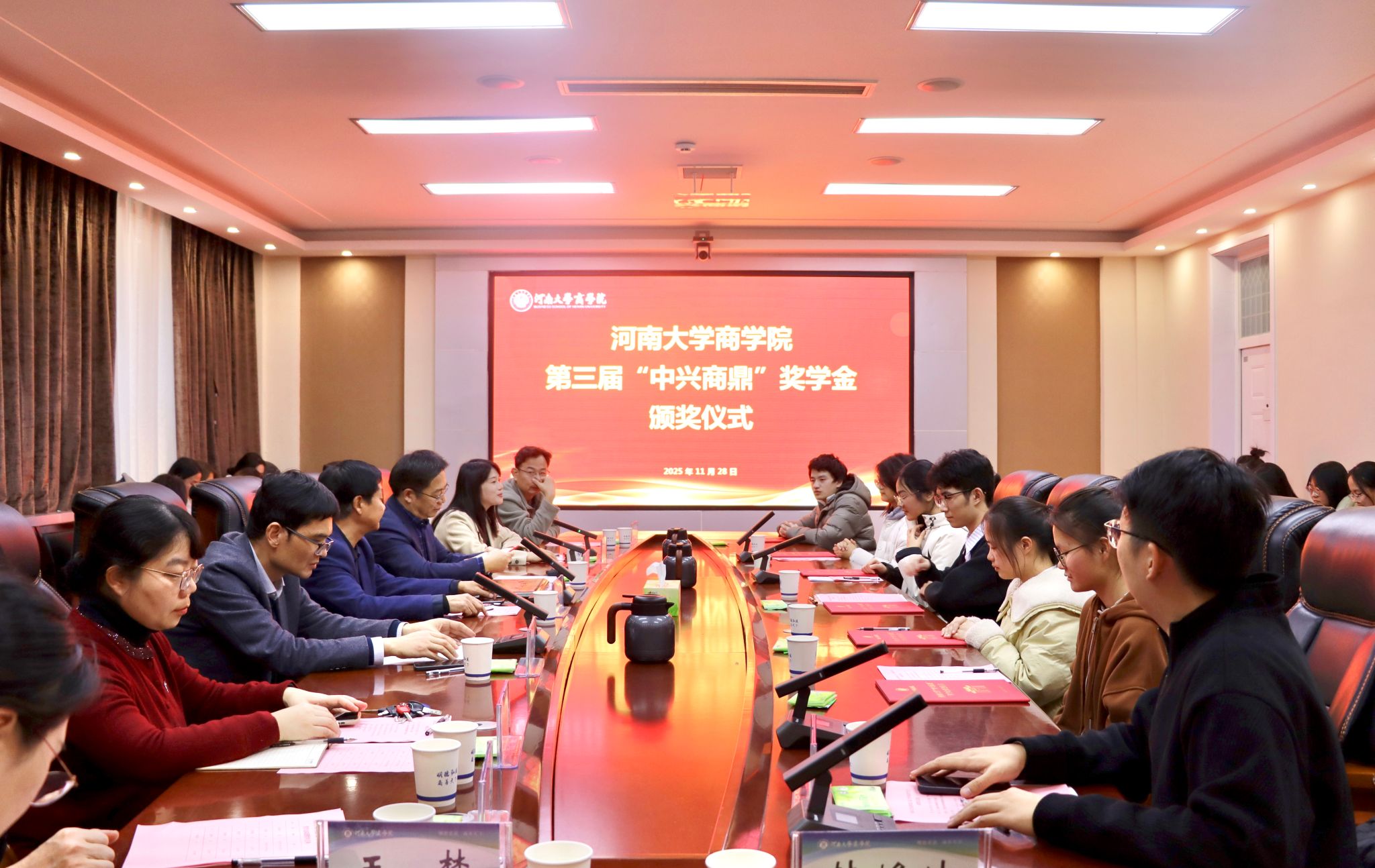 11月28日下午,商学院在201会议室举行第三届“中兴商鼎”奖学金颁奖仪式。奖学金捐赠人、商学院荣休教师刘建中,商学院党委书记左辞波,河南大学教育发展基金会办公室副主任高欢,商学院党委副书记马欢欢,会计系党支部书记杜建华,会计系教师代表,学院相关科室负责人及辅导员参加颁奖仪式。仪式由马欢欢主持。