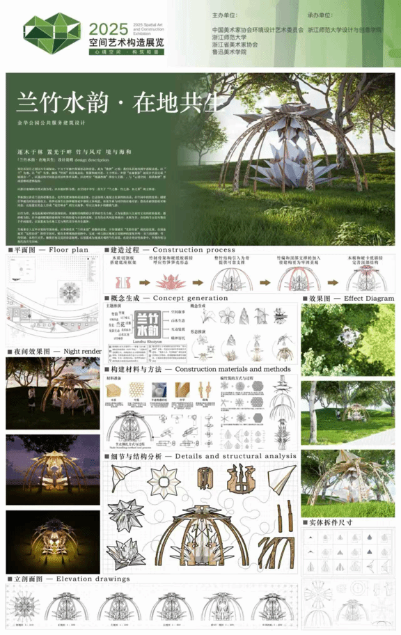 11月15日,中国美术家协会环境设计艺委会学术研究展系列——2025“心境空间 构筑和谐”空间艺术构造展在浙江金华建筑艺术公园开幕。我校美术学院构筑作品《兰竹水韵·在地共生》顺利入围受邀现场构筑,在全国56所高校的58支队伍中突出重围,荣获创新创意奖。