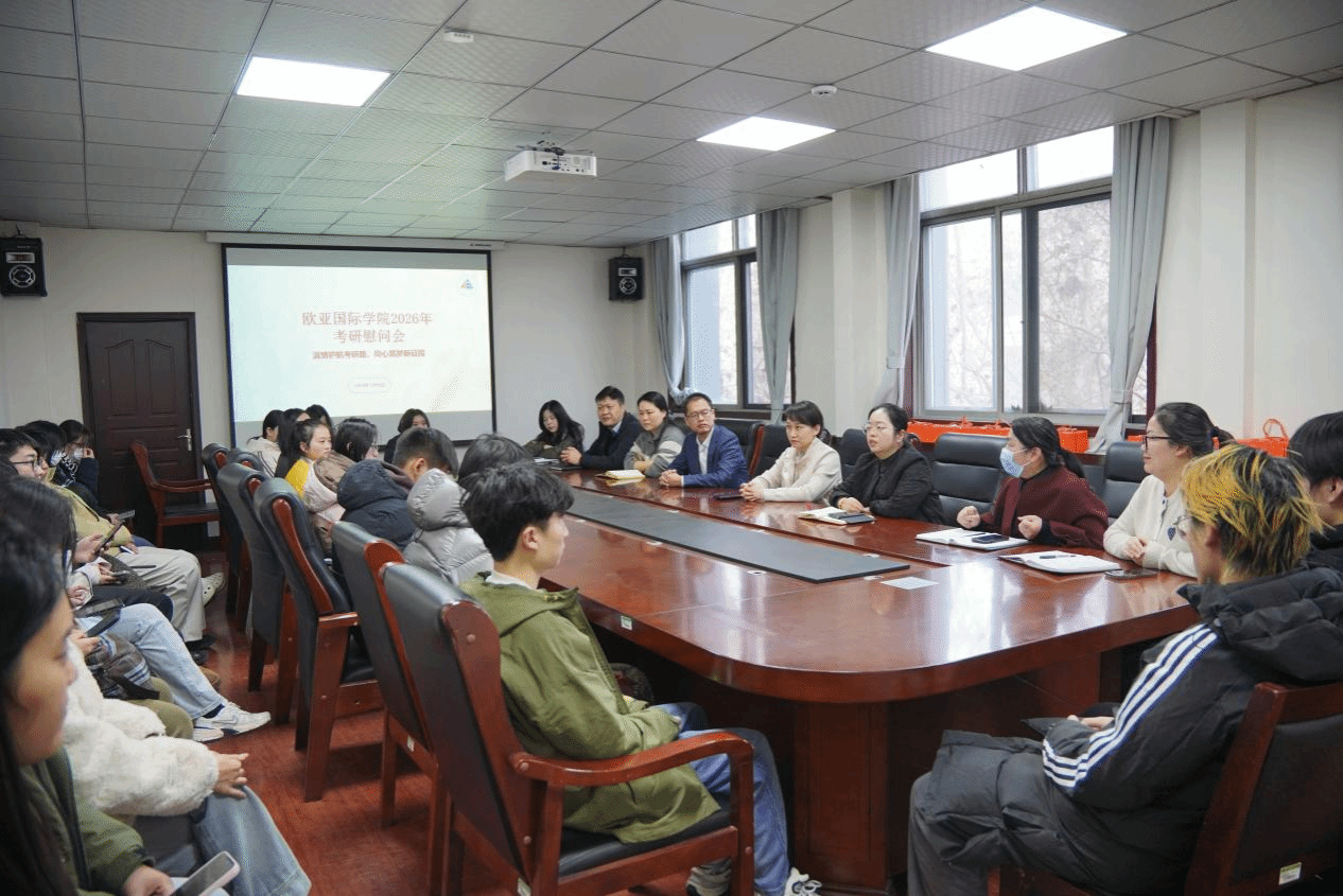 为进一步做好2026届考研学子的服务保障工作,提振备考信心,增强冲刺动力,12月4日上午,欧亚国际学院在三楼会议室举办2026年考研慰问会。学院党委书记刘佳明、院长邓浩、党委副书记贺颖、副院长苏芳芳、教务办公室主任张永钢、辅导员代表及2022级考研学生代表参加活动。