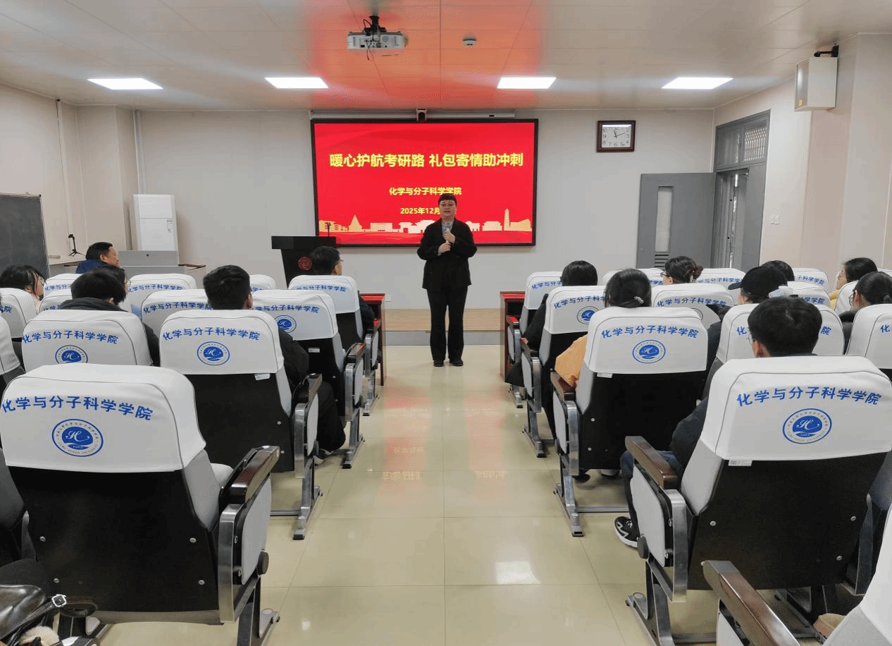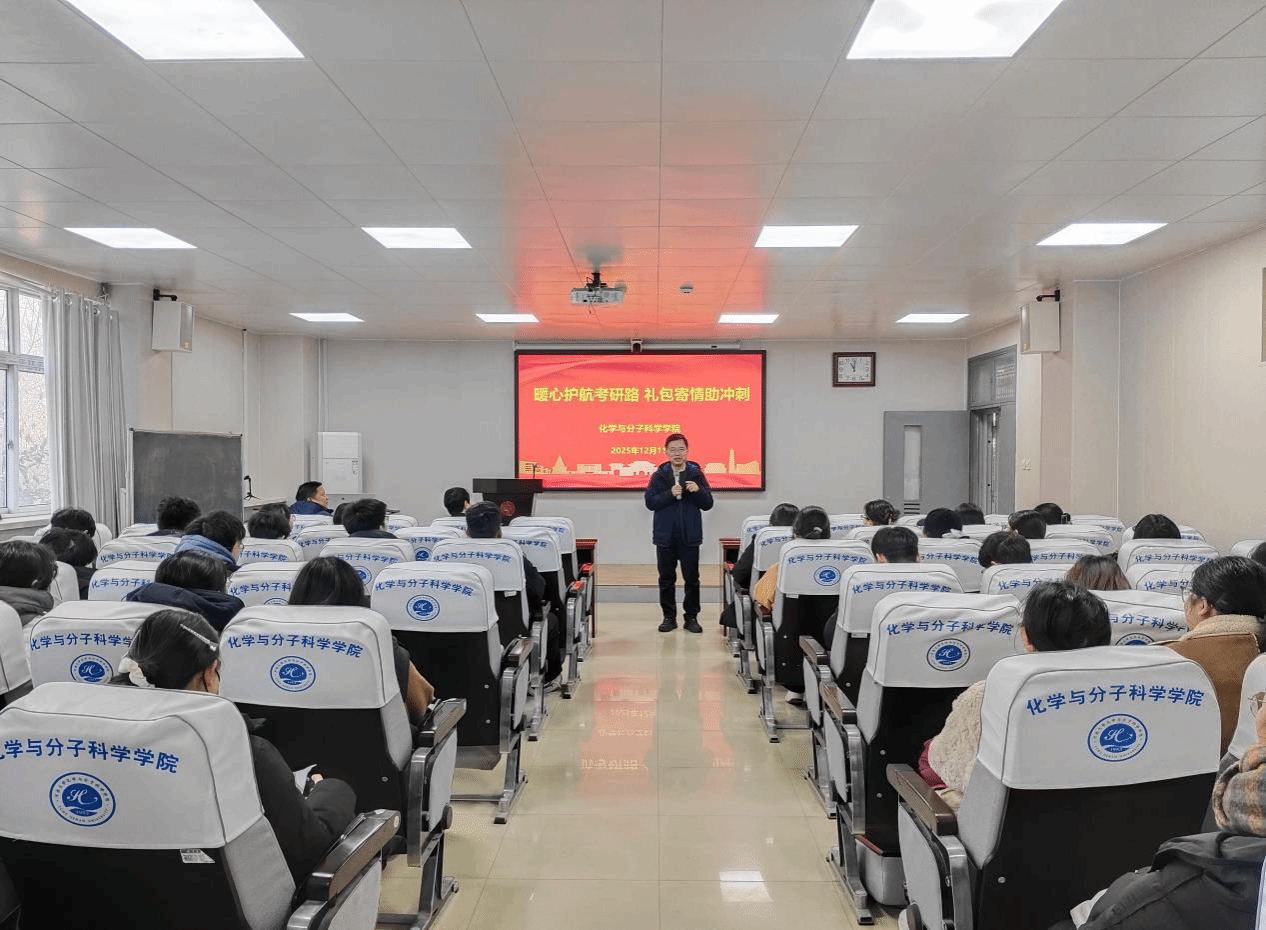 寒冬凛冽,研途滚烫;暖心护航,聚力前行。随着2025年全国硕士研究生招生考试进入最后冲刺阶段,为帮助考研学子缓解备考压力、坚定追梦信心,12月11日上午,化学与分子科学学院在226会议室开展慰问鼓励考研学生活动,并为全体备考学生送上满载关怀与期许的“备考助力包”,以实际行动为梦想续航。活动由学院党委副书记马文海主持,学院党委书记常凤香、院长陈永明、毕业年级辅导员宁攀和学院2022级近百名考研学生参加。
