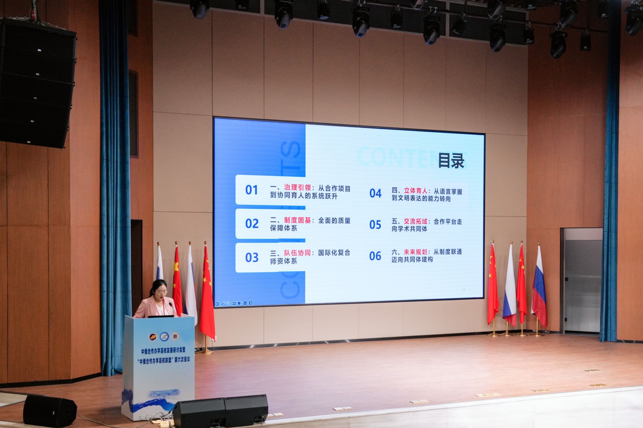 本次会议由中俄合作办学高校联盟主办,广东海洋大学承办。会议聚焦“中俄合作办学高质量发展新内涵、新特征和新目标”这一核心主题,汇集了中俄合作办学领域的各高校负责人、教育管理者及师生代表300余人参加。会上,贺颖应邀作题为《从生根到深耕——河南大学中俄合作办学的实践探索与未来思考》的主旨报告。她系统介绍了河南大学国际化办学进展及中俄合作办学十余年来的运行情况,围绕治理结构构建、质量体系建设、师资队伍支撑、人才培养成效、国际平台拓展及未来发展规划等方面展开深入分享,阐述了学院在资源共享、教学创新与人才培养等方面的具体举措与成果,并与来自全国各高校的代表就合作办学机制优化与育人质量提升等议题进行了充分交流,为中俄合作办学高质量发展贡献了“河大智慧”。